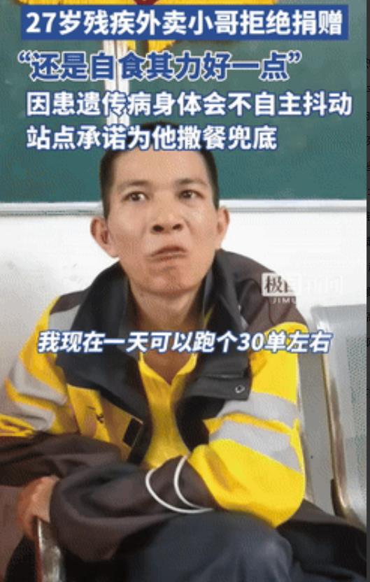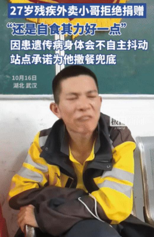 “这里没有歧视,只有骑士!”武汉一男子身体有缺陷,为了养活自己想当外卖员,结果钱没挣到还赔了2000元!他无奈换了个站点,不料站长的一句话让他泪目了!网友:这个老板才是真正的大爱之人,祝老板发财! 这个身有缺陷的男子名叫陈运河,虽然身体没有什么残缺,但是由于遗传病的原因,小陈从小身体就会不由自主的抖动。 一直以来小陈都遭受着别人异样的眼光,也承受过许多歧视,所幸小陈心态很好,不仅没有自暴自弃,反而想要自食其力养活自己。 受限于自己的身体,小陈只能尝试着从事外卖行业,不过他的第一段外卖工作经历并不顺利,不仅没有赚到钱,还遭受了一些歧视,甚至赔了一两千块钱。 小陈忍受不了前公司的氛围决定离职去别的站点碰碰运气,幸运的是,这个站点的工作氛围完全不同。 在入职的头一天,站长将站内的员工都召集了起来开了个会,站长先是介绍了小陈的特殊情况,然后强调大家是一个集体,不希望出现互相歧视的风气。 站长把丑话放在前面,直言:“如果有人敢嘲笑歧视别人,就别怪我弄你!” 除了不要歧视站长还希望大家多多照顾小陈,如果他遇到什么困难,大家能力所能及的去帮一帮,因为这里是一个集体,大家一荣俱荣一损俱损。 站长的一番话让小陈非常感动,也展现了站长待人接物的态度,换做是其他人,可能一开始就不会给小陈这个工作的机会,就更别提会不会歧视了。 小陈的事情传到网上后,很多网友非常同情他想要给他捐款,但是通通被拒绝了,比起接受捐款,小陈认为自食其力更好。 同时小陈还解答了一些网友的疑问,有网友担心他的身体情况骑车会不会有危险,小陈则表示自己从2016年开始骑车以来都保持着良好的驾驶习惯,至今0事故,所以大家可以放心。 小陈对自己的未来也有一些规划,他想通过跑外卖攒点本金,之后盘一个小摊做点小生意,如果可以的话讨个老婆和爸妈一起好好过日子。 有网友说:“小伙坚强,靠自已的实力吃饭精神可嘉,不像那些四肢健全的人偷抢要强,但是还是要注意安全。” 还有网友说:“让他送奶茶,拿过来的时候他还能给我摇,多好。” 也有网友表示:“做别的工作人家也不要他啊,这个老板不错没有嫌弃他。” 看到网友对小陈的关心真的很感动,在充满钢筋混凝土的城市里,这样的人情味总能打动人心。 希望大家都能善待他人,生活不易,希望我们都能成为别人的爱心骑士。 也许你的一句问候,就能改变他人的一生。 (信息来源:观庐州)