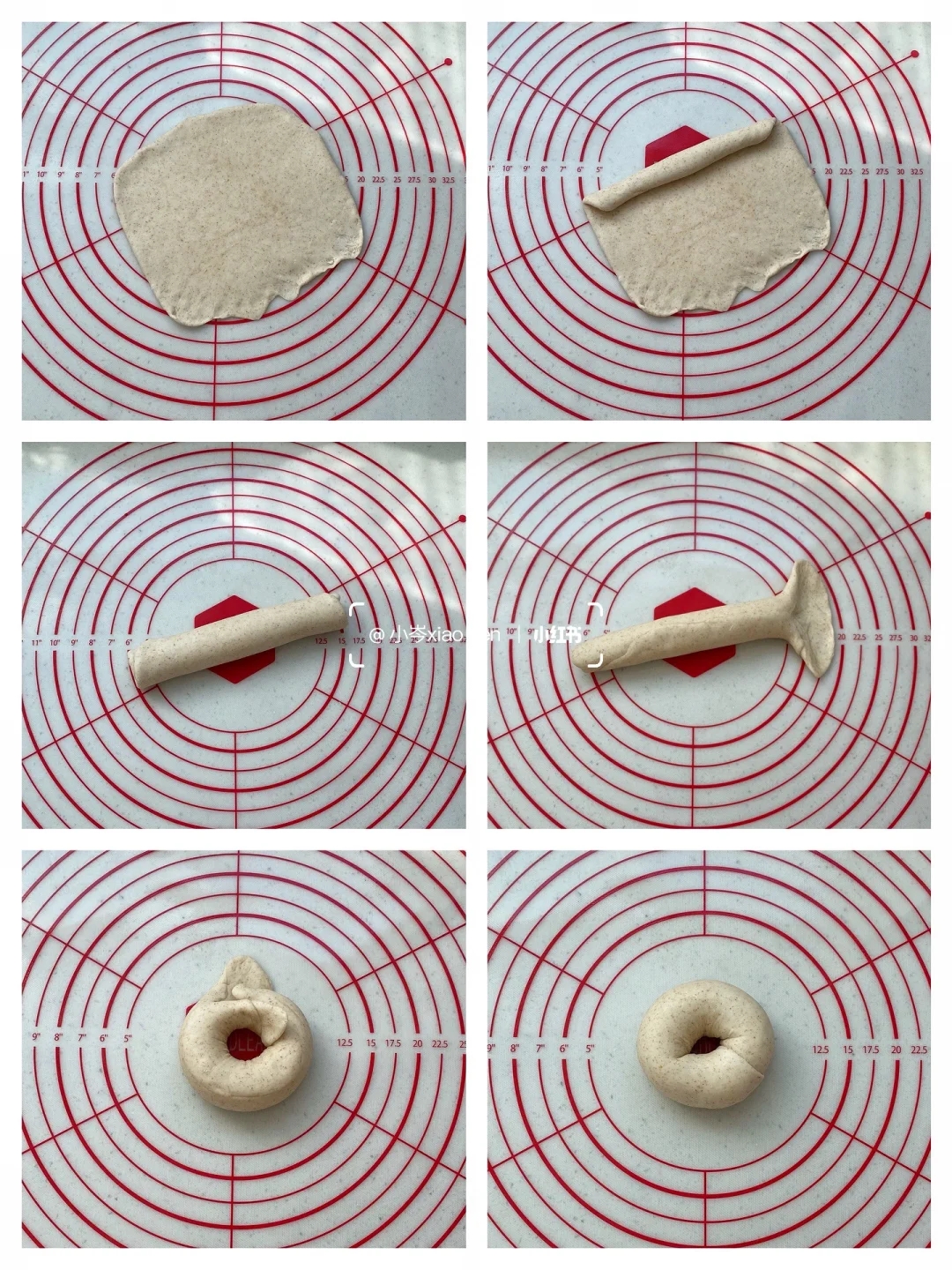 6.锅里放入红糖和水混合,水温80度左右,将发酵好的面团放入糖水锅中,两面各煮20秒,捞出沥干多余水分,摆放在垫好烘焙纸的烤盘上。