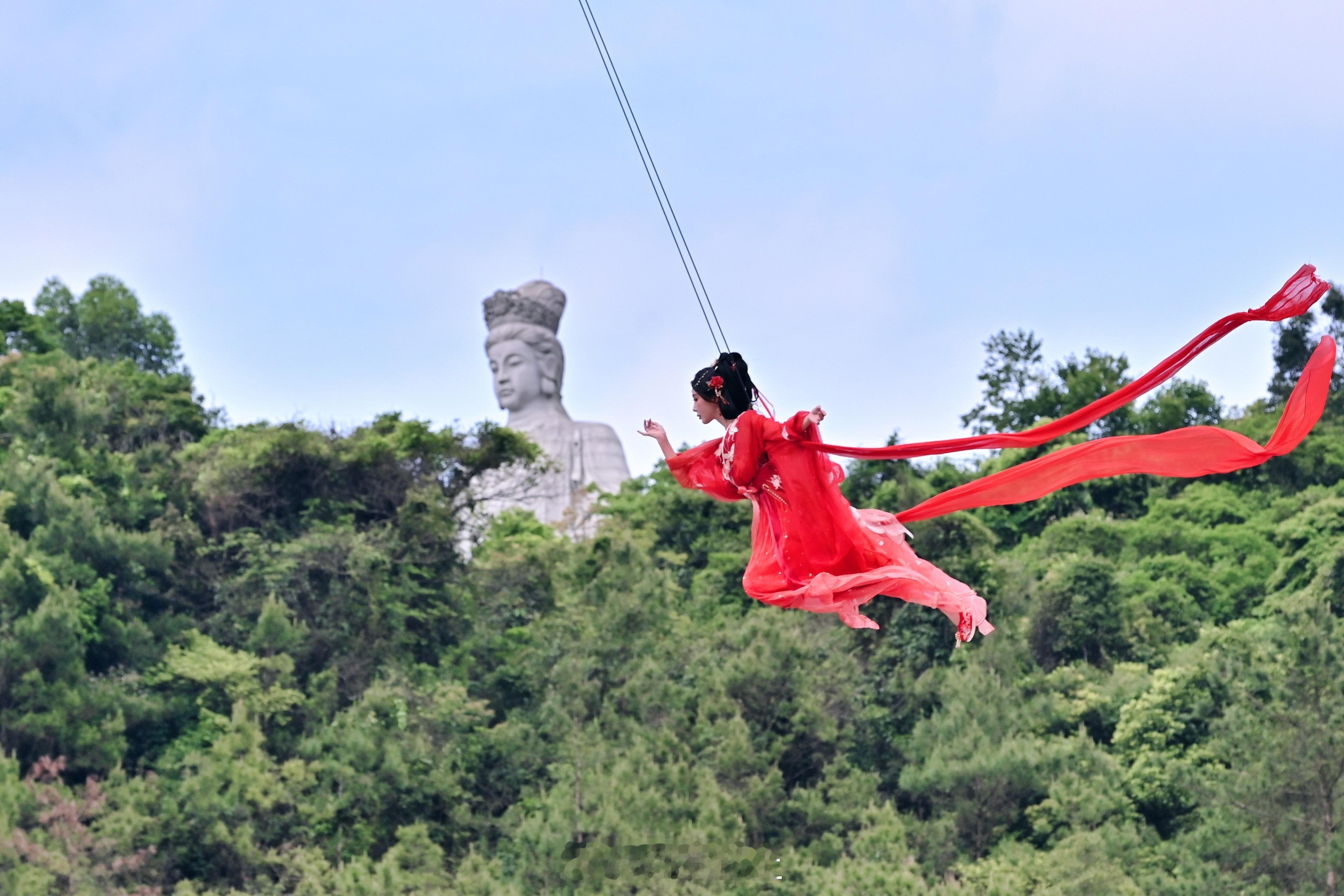 #东莞观音山来了就好# 给大家推荐一个家门口的网红打卡地——东莞观音山,深莞惠自驾只需要一小时哦。这里不仅有高空滑索,让喜爱刺激冒险的你大声尖叫,欢乐解压;如果你热爱汉服,你可以身穿汉服,打卡网红飞天威亚,化身影视剧中的侠男侠女,圆您儿时的武侠梦、飞天梦。