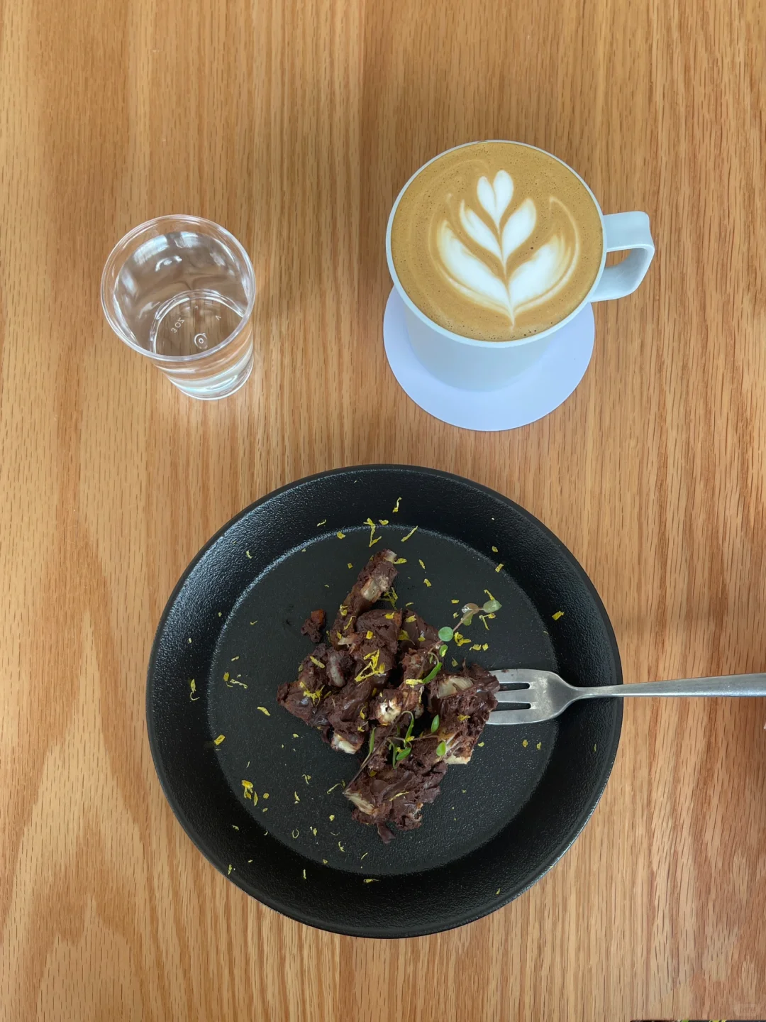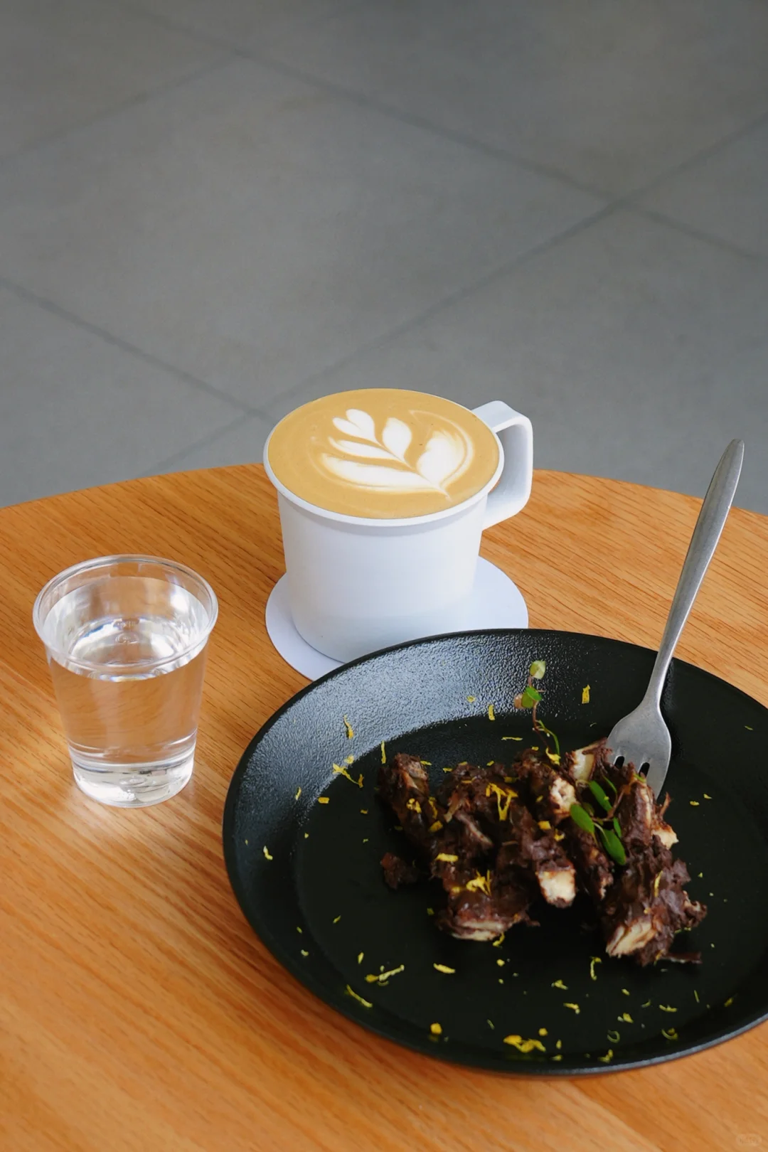 种类不多,点单规则是选豆子+做法,深耕在咖啡精度,让人好感大增。小餐点的种类也算丰富,吃到了“暗黑料理”,天才的料理作品,微苦的巧克力混合鲜甜的鱿鱼干,撒上一点柠檬皮,太和谐太美妙了。下次来准备试试司康。