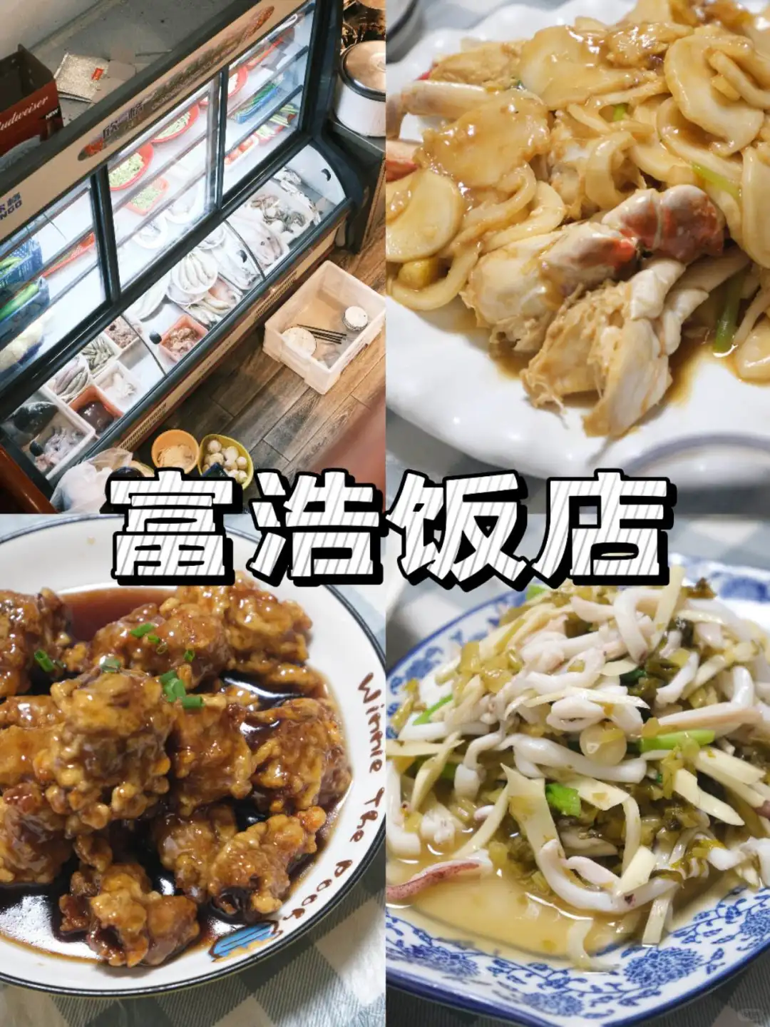 是哪位天才博主想出来的宣传语!!!富浩确实像回爷爷奶奶家吃饭,连装修风格都像是家里的两层小楼改的。 ◽️ 味道就是家常菜的味道,菜品全部展示出来,在一楼挑选好就可以入座了。糖醋排骨脆脆的面衣裹了糖醋汁好下饭。白蟹炒年糕的年糕超好吃,不过梭子蟹是冻的,肉质口感收腰诶差点儿。鱿鱼炒茭白的搭配还是少见的,换成笋丝感觉更好! ◽️ 奶奶很贴心,随时提醒我们不要点多了。 🏡:富浩饭店(解放南路店) ⏱️:周一至周日 11:00-13:00 17:00-20:30 📍:月湖街道解放南路333号