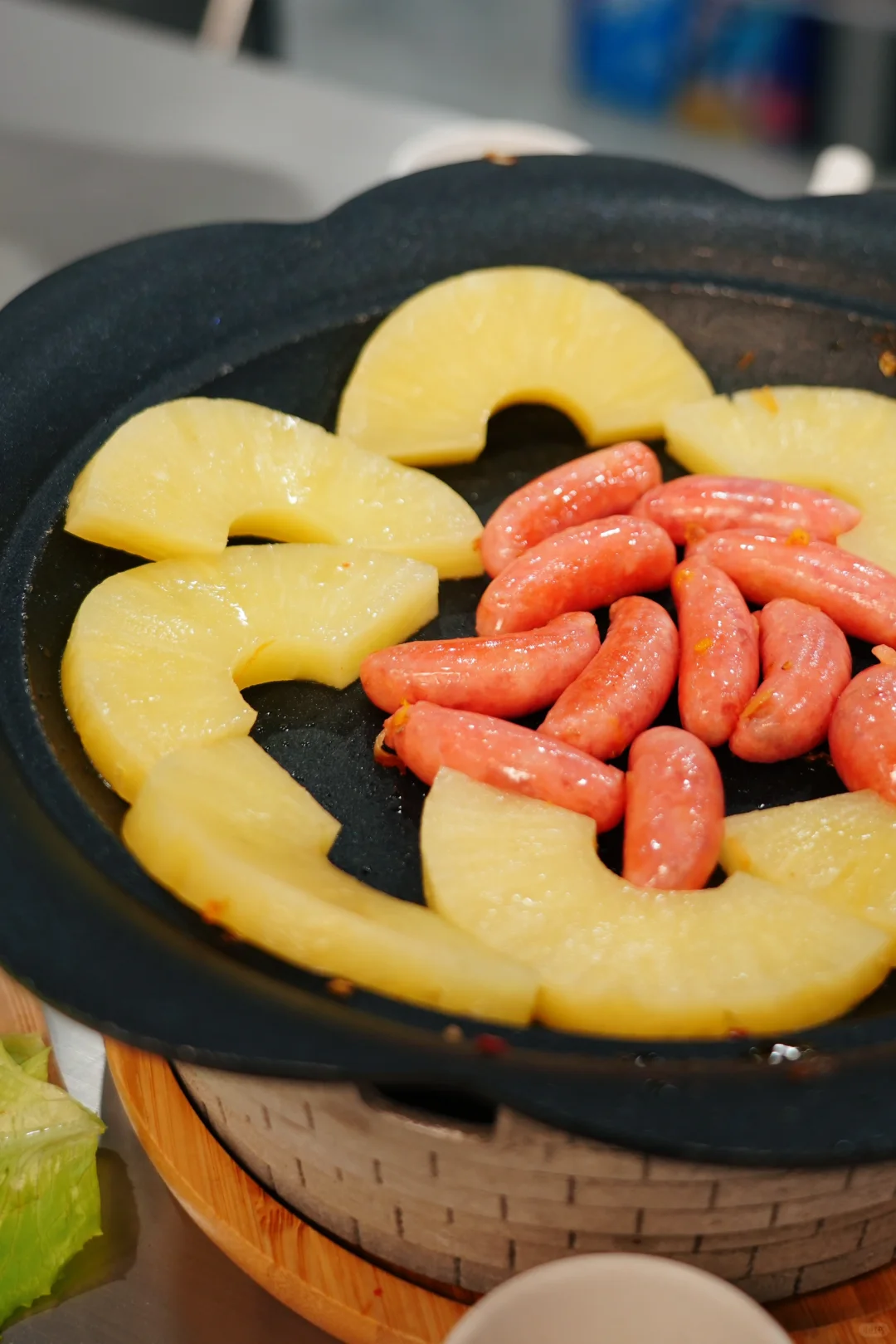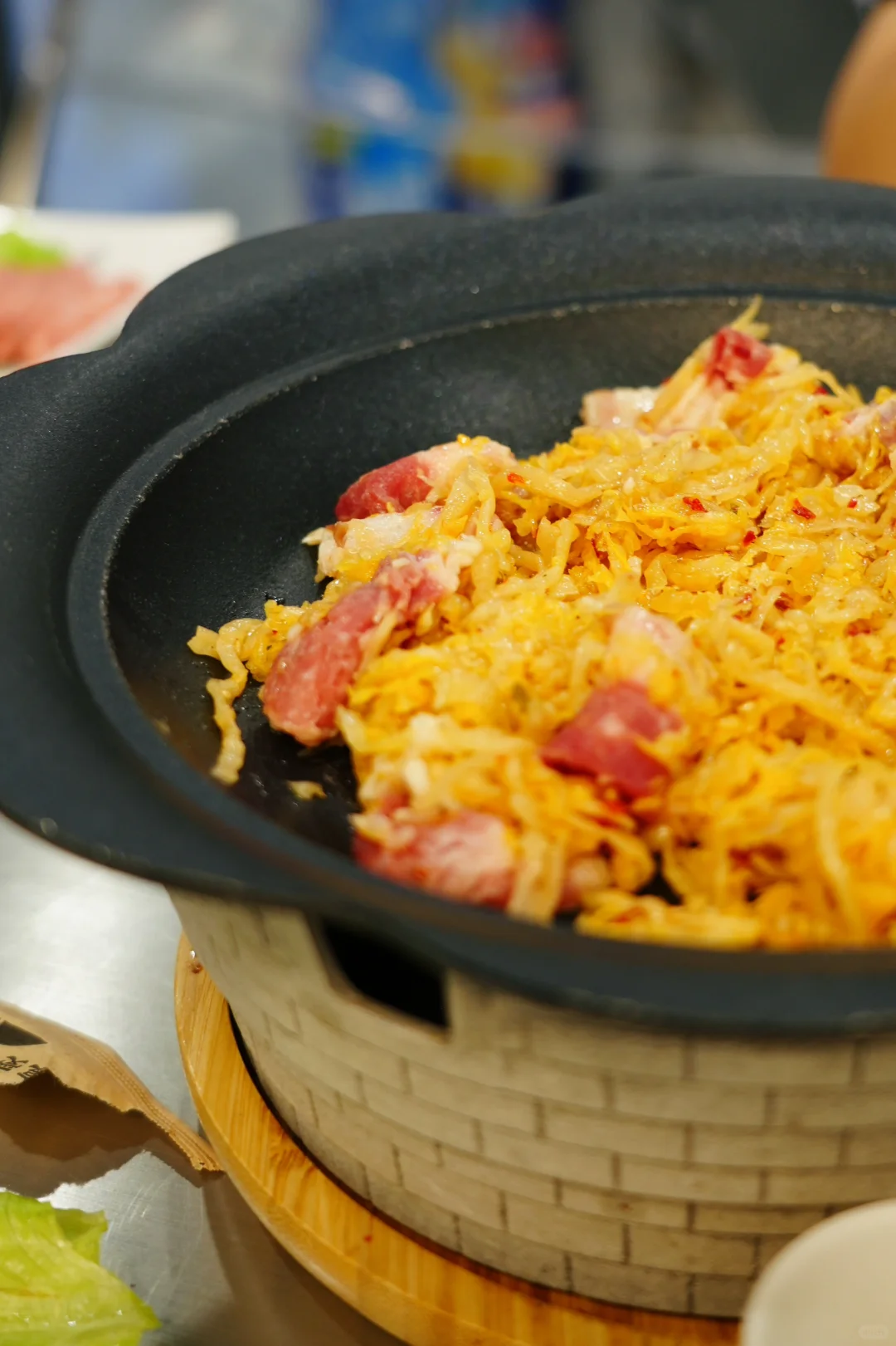 烤肉还是中规中矩的,每桌上有一个小锅,肉自身出油比较多的,旁边也有油瓶可以加油,就是容易溅油,可以当心一点。桌上有四种干料,挺好吃的。烤菠萝甜是甜的,但没我想的好吃,煎不出糖壳。爆爆肠甜甜的,适合无锡口味。说回蒸饺,每桌限点一盘,还不能外卖,等的时间也比较长,里面是正宗的酸菜馅,比较松散。但是受凉之后,蒸饺皮会有一点硬,我创新了回锅煎的吃法,直接变成脆壳,也挺不错的。