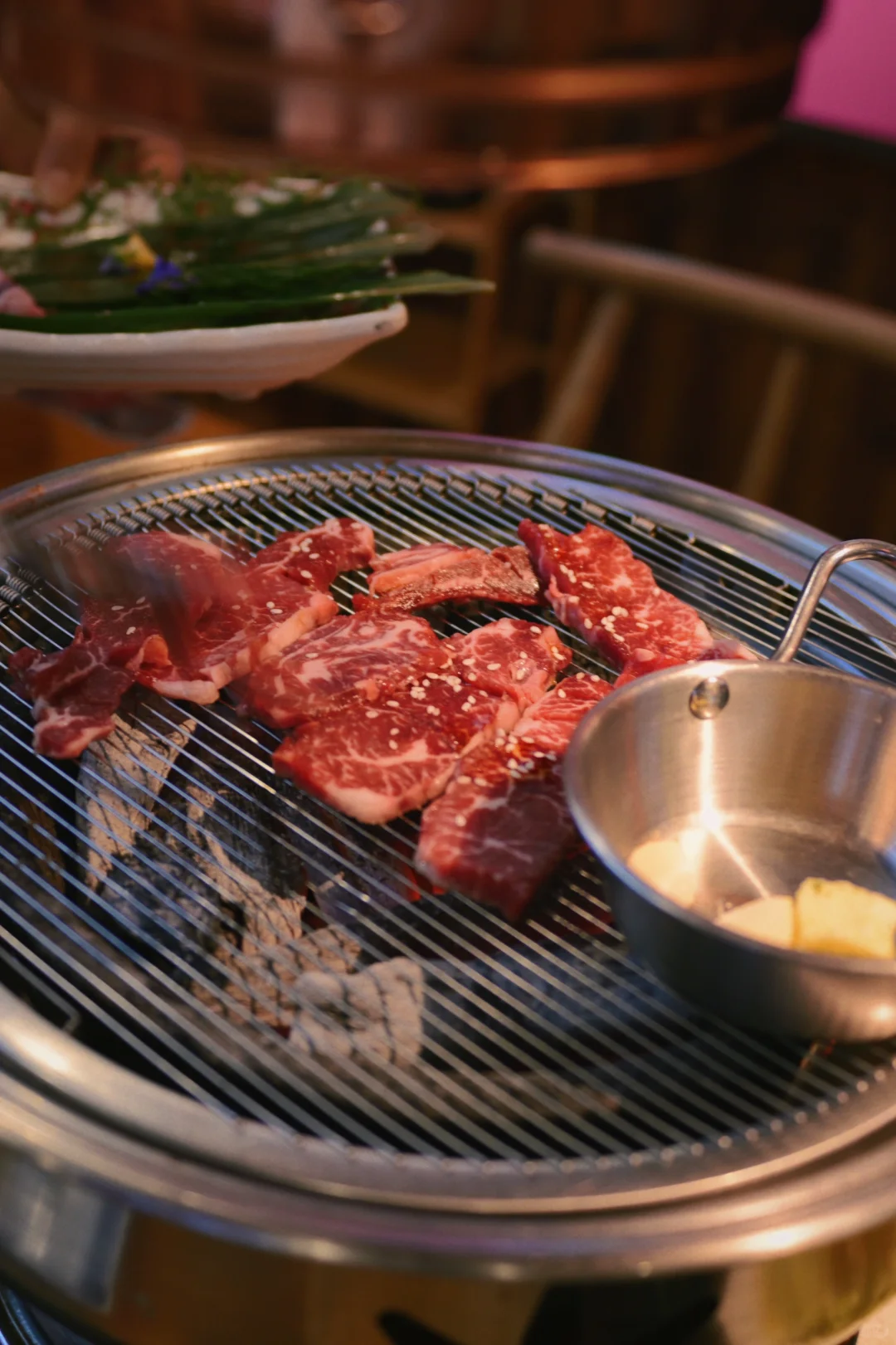 很想吃烤肉配大白米饭,十全街上的这家出现频率高,评分也不错。人气很旺,三楼是专门的等待区域,但是小空间人多虽然有空调还是很热。楼下烤肉炉太热,一顿饭下来也冷不下来。