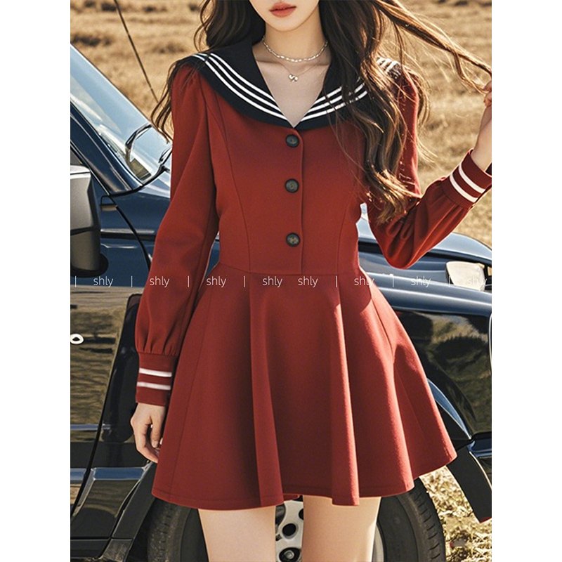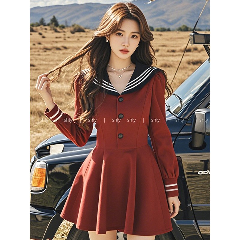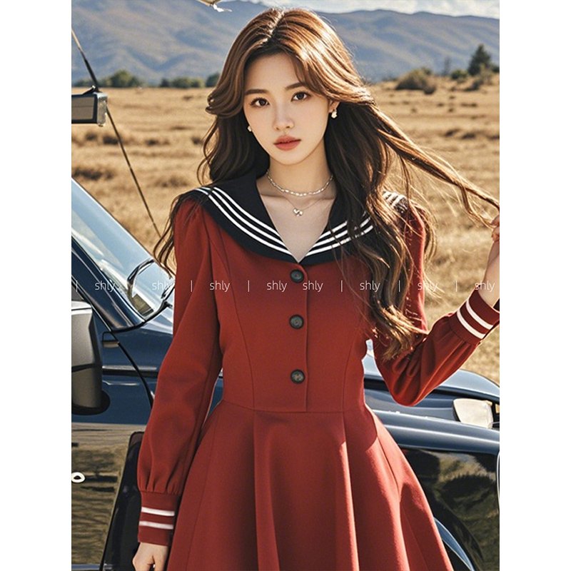 红色海军领连衣裙子秋季女2024新款
