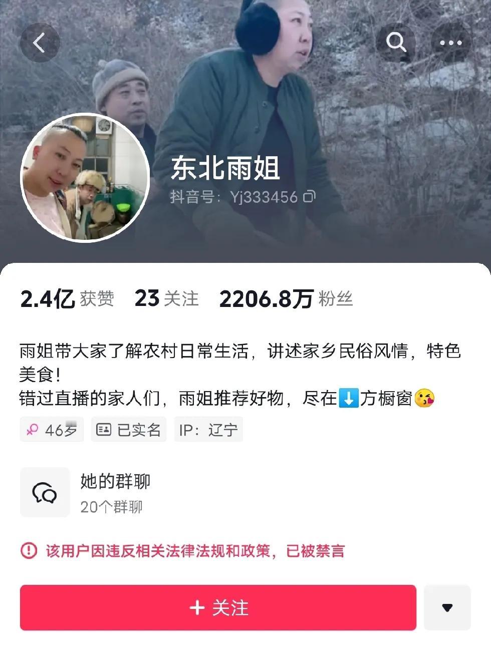 东北雨姐,随着央视大篇幅的报道,迅速陨落。目前账号显示,该账号因违反相关法律法规和政策,已被禁言。 违法被禁言没毛病。但并没有提封号,那就是还有可能回归。 今天讨论个问题,是一个小人物不能理解的问题。都那么大的网红了。为啥不选择诚信经营呢?做个好人,正能量,遵纪守法,他们不是一样吃香的喝辣的吗?互联网+吃的是国家的红利啊,吃的是人口多,网民多,天下太平的红利。为什么就不能诚信经营呢?一口一个老铁,家人们,怎么就这么坑家人。 就说,红薯粉,木薯粉,产品首先吃了是健康的,卖啥说啥,怎么会有问题?你卖合格的木薯粉,安全可靠又好吃,大家也一样会买。只是利润没那么高。 这里还提一提辛有志,辛巴。我觉得辛巴活明白了,辛巴徒弟蛋蛋也活的通透。他们是头部主播。辛巴资产究竟有几个亿,几十亿,或者几百亿,这都不重要。重要的一点就是三辈子辛巴也花不完。那主播还要坑家人干什么?主播这一辈子的钱都花不完,而全国大多数人生活都在为了钱奔波。我们的目的就是赚钱养家。而财富自由的辛巴,也有目的。那就是把企业做好,手下有几千人跟着辛巴吃饭呢,先让员工有饭吃,再给不说家人,就说很多普通人,准备至少达标的产品,辛巴说白了,他就是分享好物,赚取一点点佣金。虽然佣金赚的少,架不住基数大啊,一百亿,就算赚4、5个点,那还是4、5亿呢。他还可以继续做慈善。给员工加福利。总之,辛巴辛选真心服务社会的。因为他们活的通透,真心服务也不影响赚钱。只是没必要暴利敛财,说白了,给你一万亿,你能花多少?对吧。给你一百万亿,只能带地府花,因为现实社会花不了那么多。说一年花千万,那也是纯纯的肥了别人,有钱也没必要如此,那就是败家。当然了,这里不谈败家,就谈头部主播,能不能活的通透,明白。有很多主播,都是财富突然暴涨,懵了。不知道下一步怎么办了,会被身边的人裹挟走错路。所以,我这里也大言不惭,给头部主播上上课。当你每天赚几分,几毛,甚至几块钱的时候,无所谓。几百,几千,也没说的。如果每天赚了几万,几十万。每年赚了几百万,几千万,几亿的时候,适当给自己和团队放个寒暑假。好好出去玩一玩,放空自己。想一想赚钱的目的。如果为了养家的目的达到了。是不是要考虑社会责任。有了社会责任,对社会负责,也是对自己人生价值的负责。也会让你们大网红得人生,更精彩,光彩。也能给网红这个词,添彩。 我们羡慕大网红,但不敬大网红。我们尊敬善良,有爱,有亲情,友情,国家情怀的人。