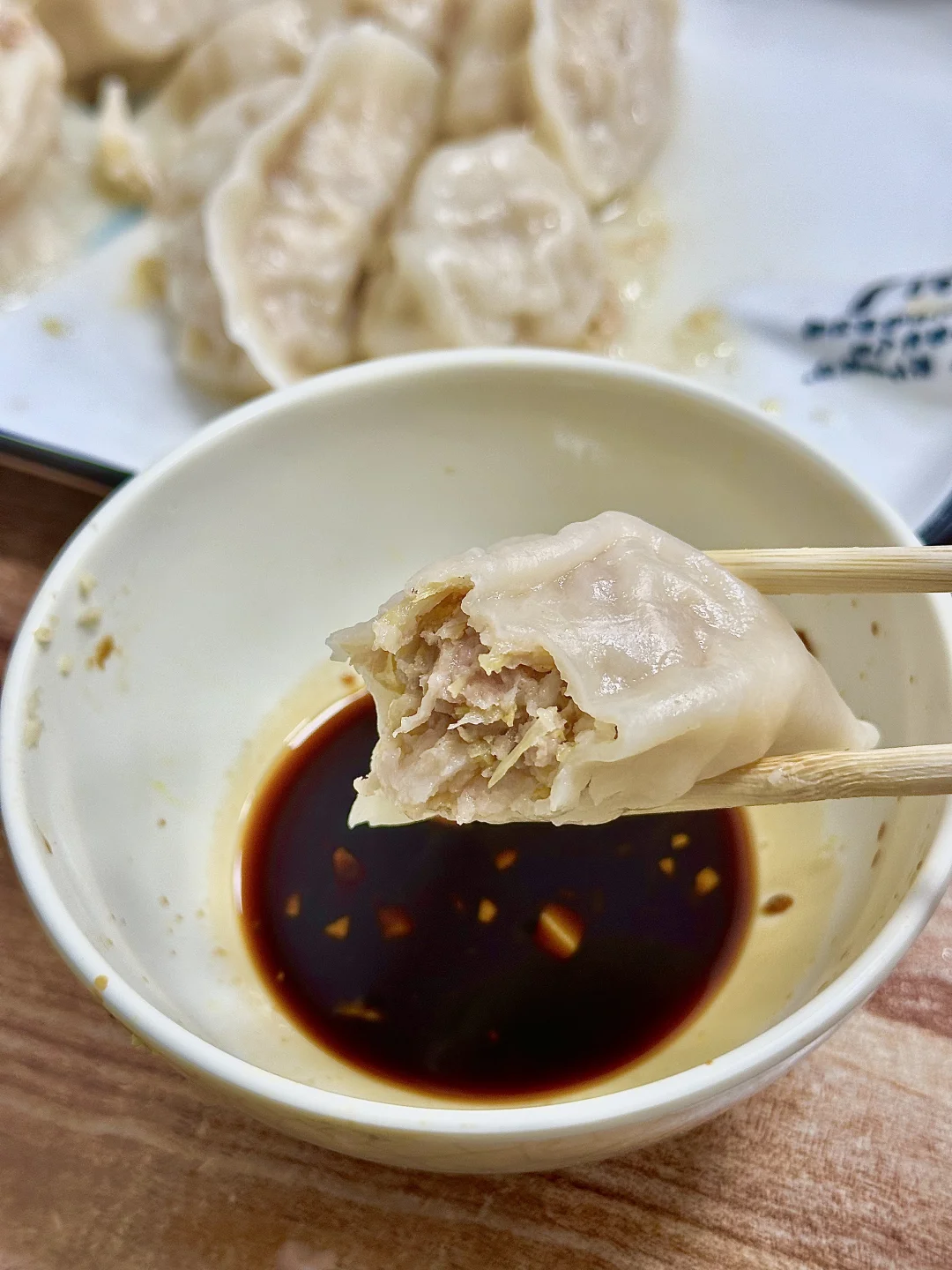 第一次吃酸菜猪肉馅儿的饺子,皮薄馅大,真的很大颗