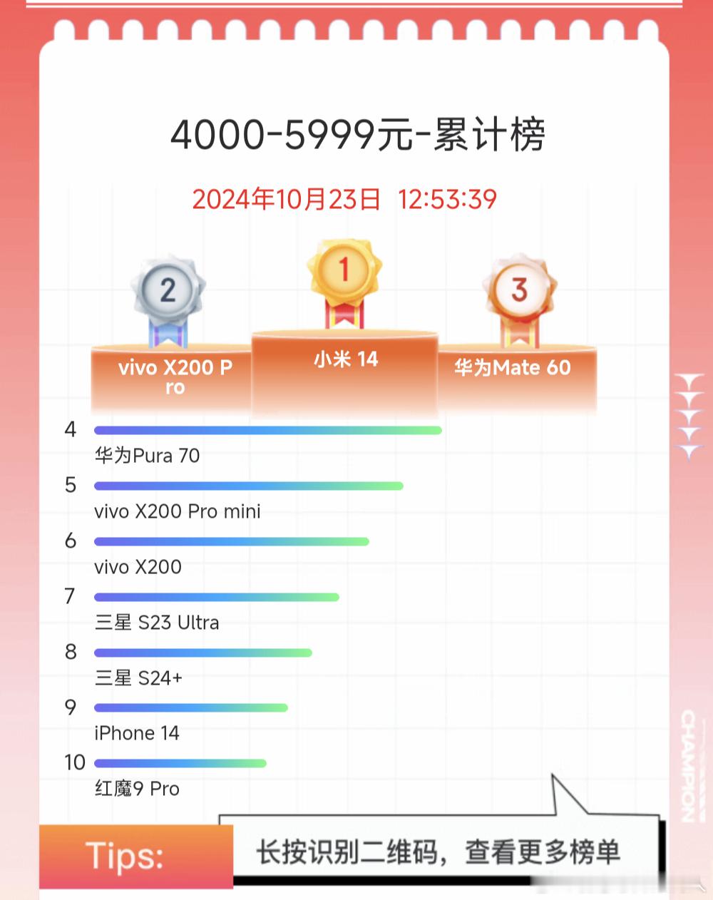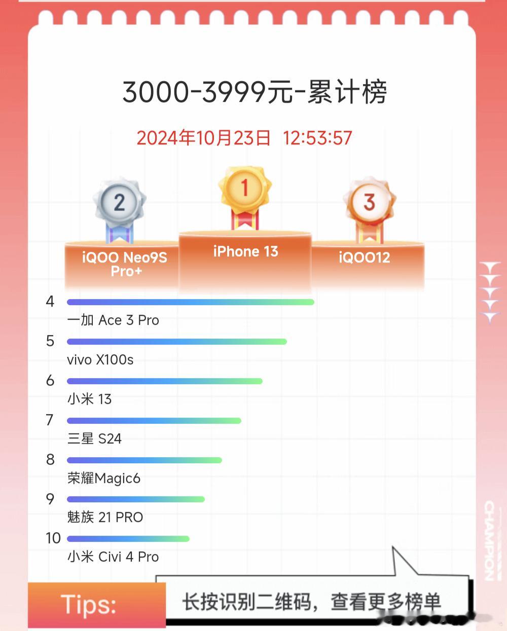 京东手机竞速榜当前的累计榜单,大家参考。各档位的区分还是非常分明的。