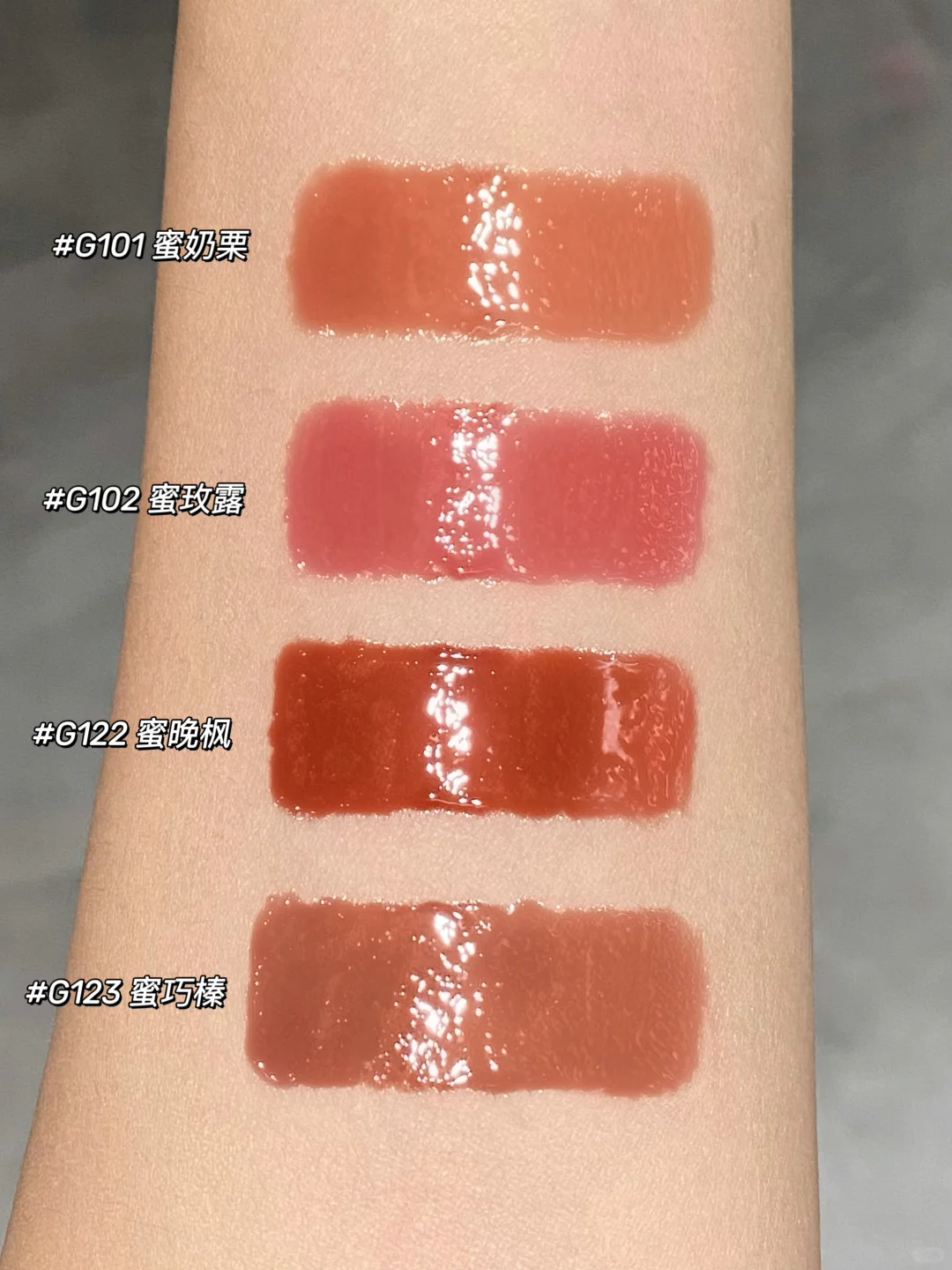 卡姿兰唇部精华蜜怎么悄咪咪出了新色! 对不起是我来晚了! 这两只简直和秋冬毛衣适配度max!!! 涂上秒变水光啵啵唇 干唇狂喜! G101 蜜奶栗 超提气色的奶栗棕 白开水天菜 G102 蜜玫露 淡颜玫粉色 妈生粉唇巨显嫩 G122 蜜晚枫 超显白的红棕色 百搭不挑皮 和白毛衣巨巨巨搭! G123 蜜巧榛 低饱和榛子奶巧色 mlbb日常通勤也能完全hold住