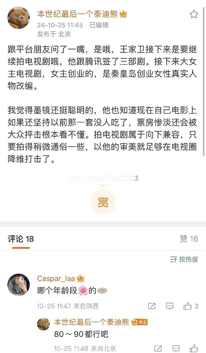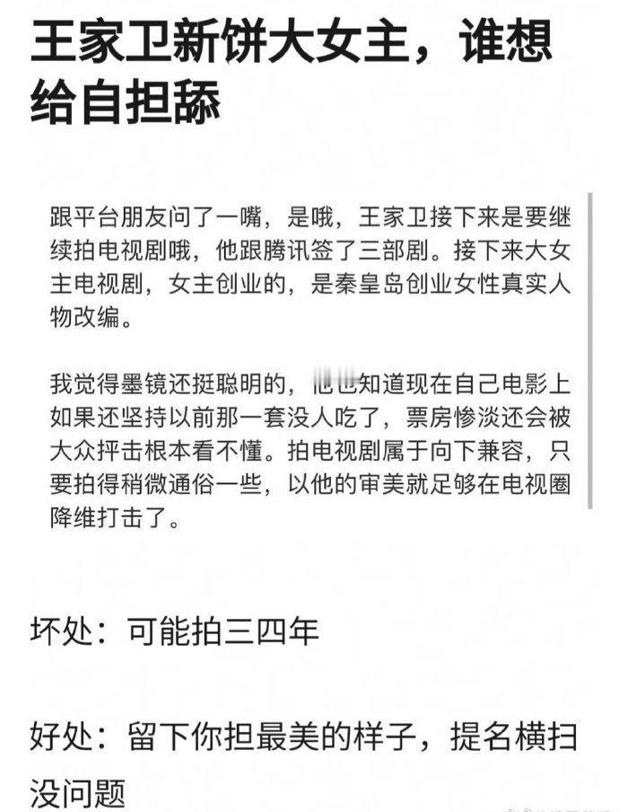 #网传王家卫要拍大女主电视剧##王家卫将拍女性创业题材# 据网传消息,王家卫有意执导大女主电视剧,以女性创业为题材,基于秦皇岛创业女性真实人物进行创作。王家卫的作品常常能带给观众独特的视觉享受和情感共鸣,这次他对女性创业题材的尝试,让人充满了期待,期待他能为我们塑造出一个鲜活而励志的创业女性形象,展现女性在创业道路上的坚韧与智慧。