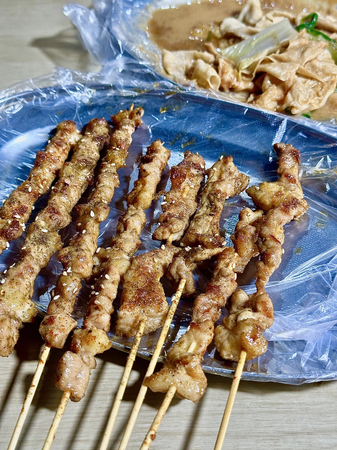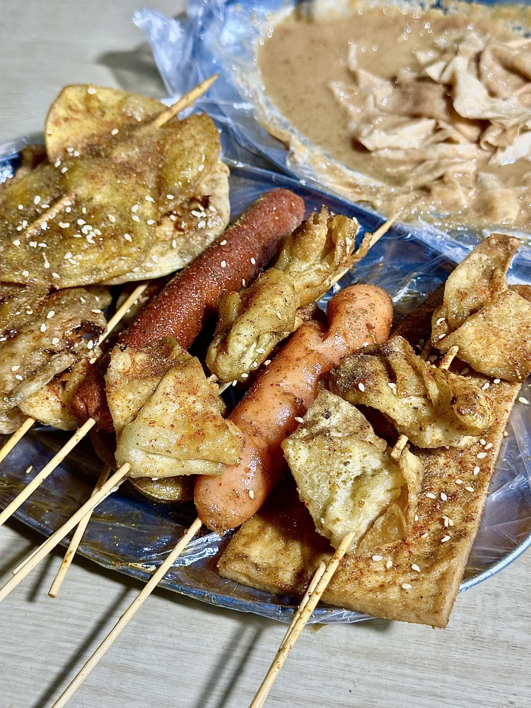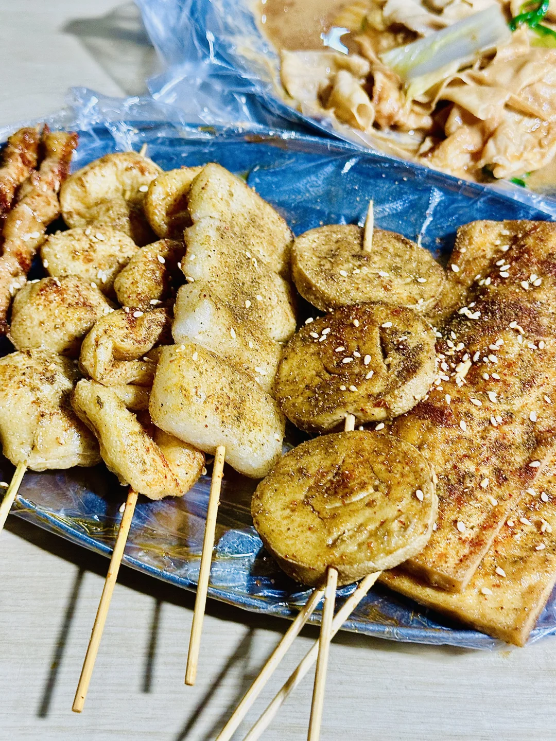 又又又来吃这家烧烤店了。爱惨了 这家开在岱山的玉梅烧烤店真的是不起眼 这次我跟阿姨说上次来吃有点咸了。 阿姨解释:上次和她老公没有配合好,一人撒一样料。 这次全程阿姨烤的,她家的豆干和肉串,炸扁食,成为我的心目中top1️⃣,无敌了🤩 拌豆皮和蔬菜我更喜欢蔬菜。 真心推荐大家去试试,实惠又好吃😋 本次自带奶茶,消费75➕