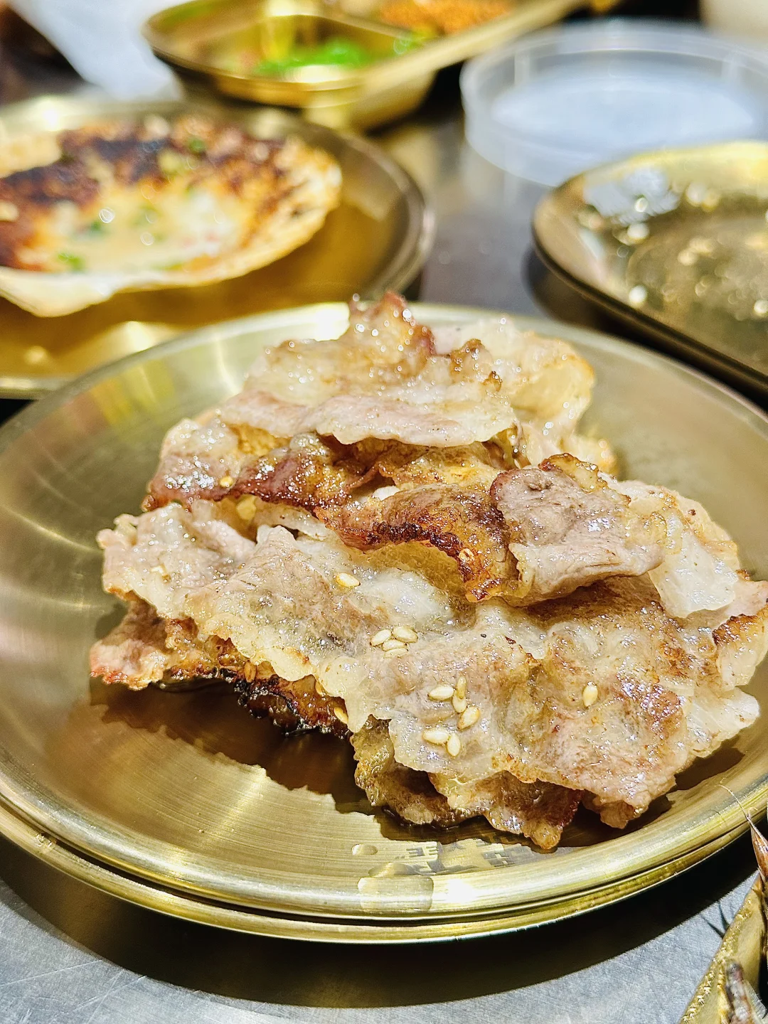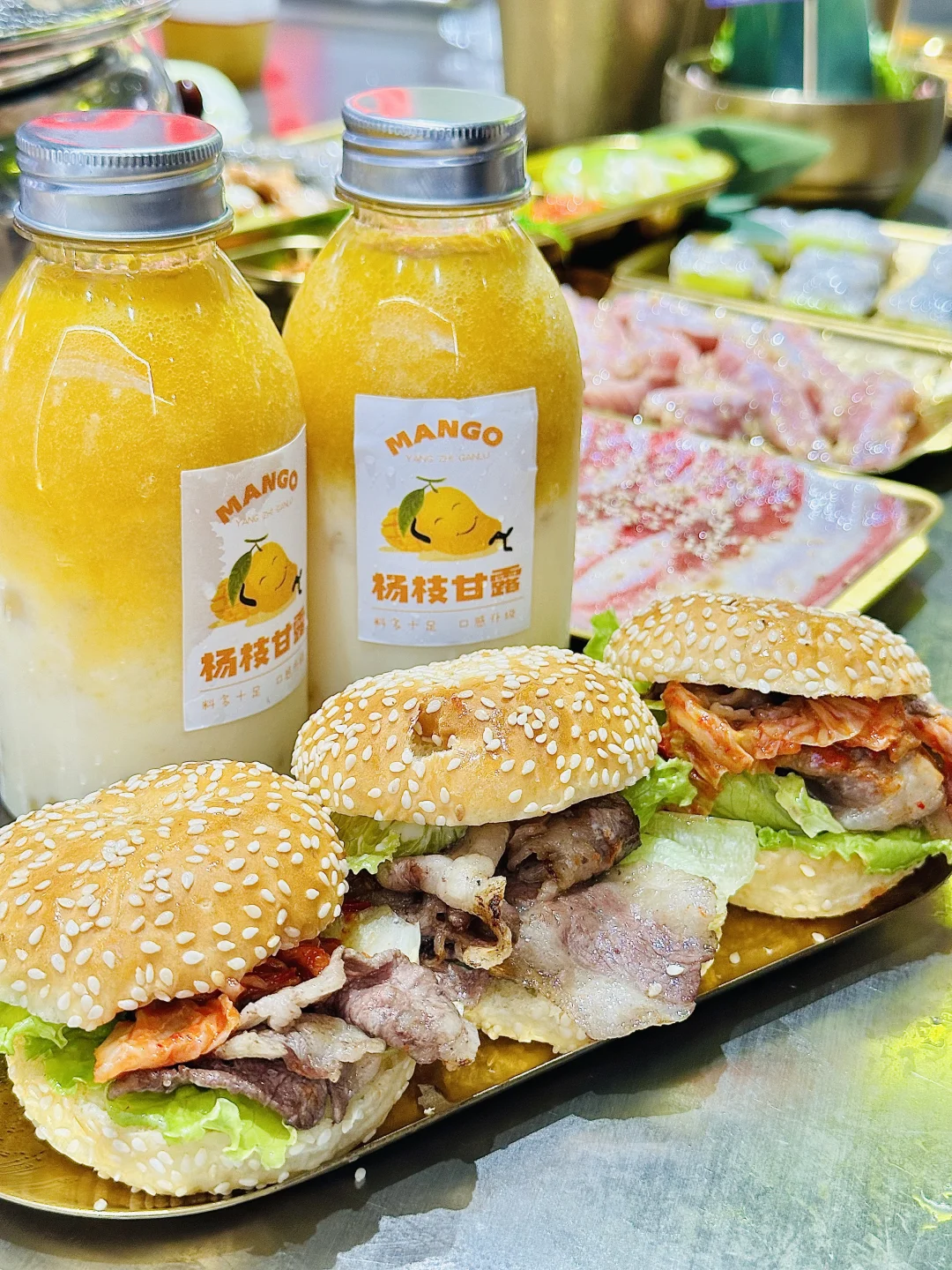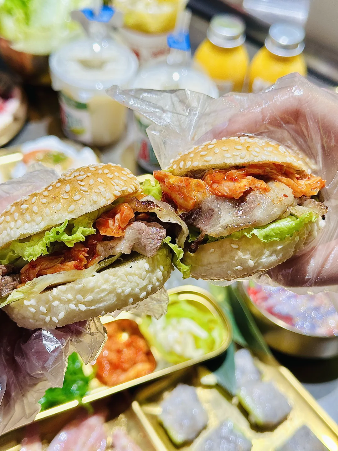 点了汉堡胚,在烤盘上烤的外壳酥脆,再把烤好的肥牛片做成小🍔,建议放点泡菜,海草一起吃,很不错哦