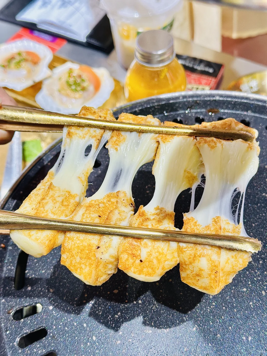 芝士条烤完还会拉丝,外壳干香,沾上炼乳,咸甜香。