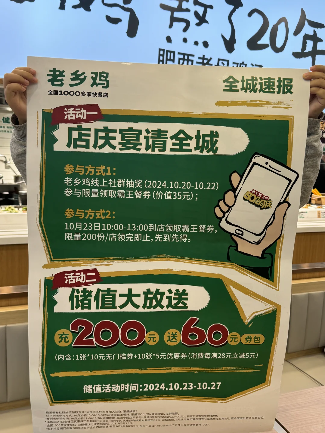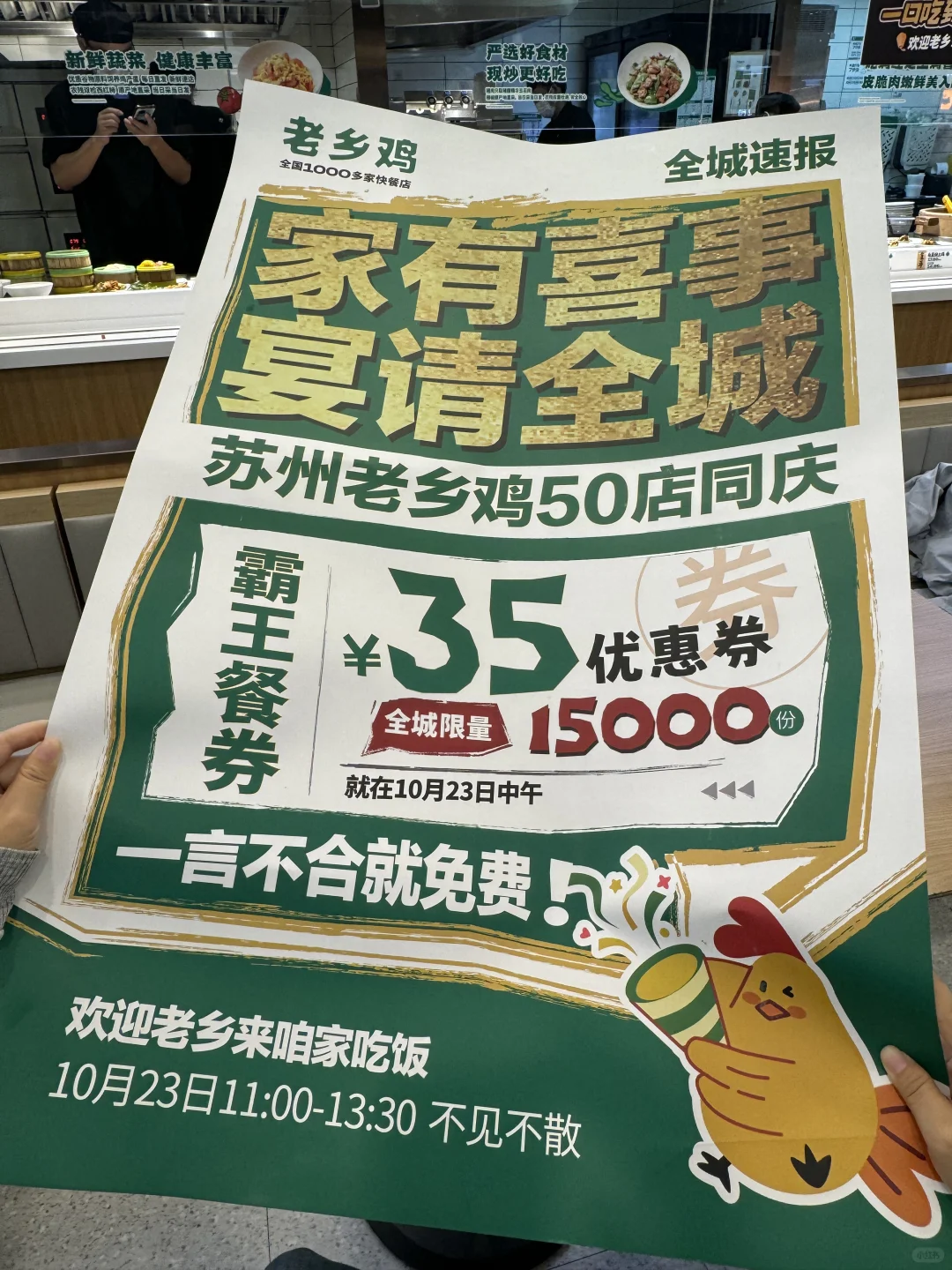 就在10.23中午11:00-13:30速来老乡鸡!!宴请苏州人民!🆓吃大餐!!先到先得,领完即止,真的太豪气了!快来一起参加吧