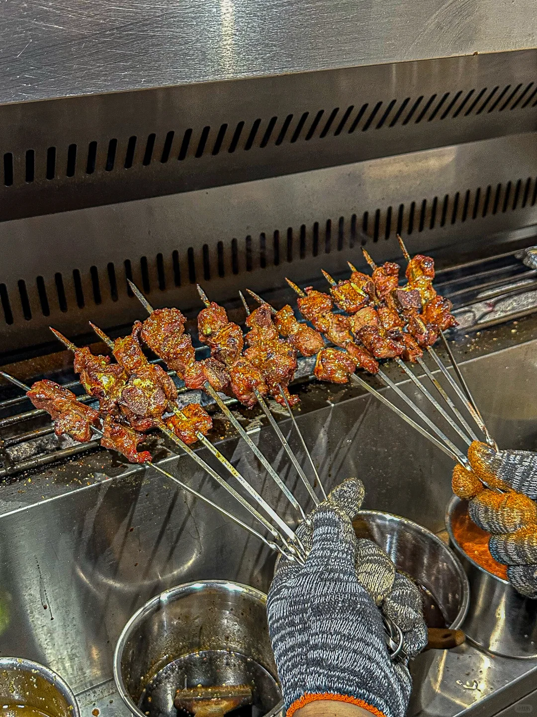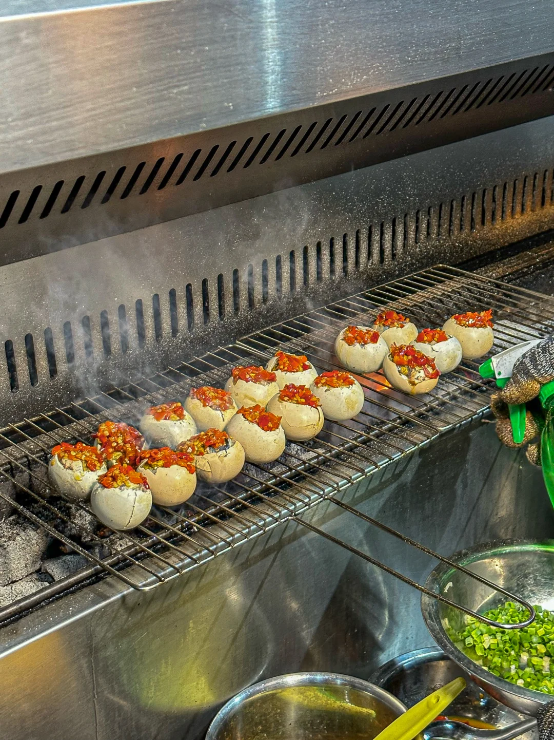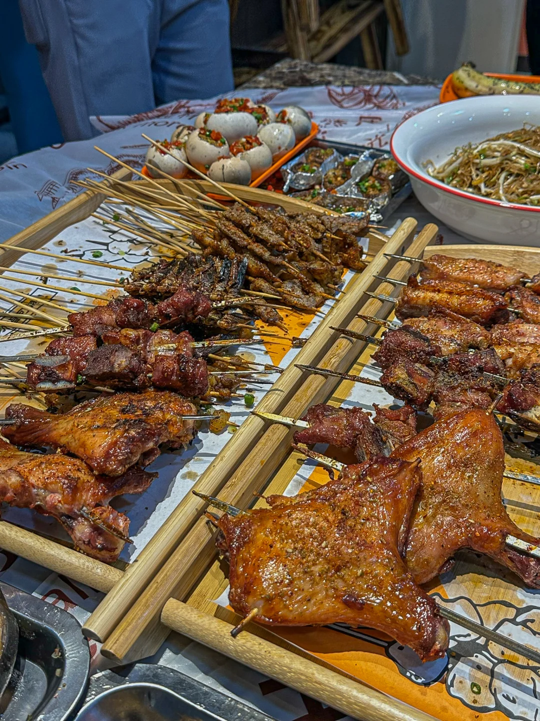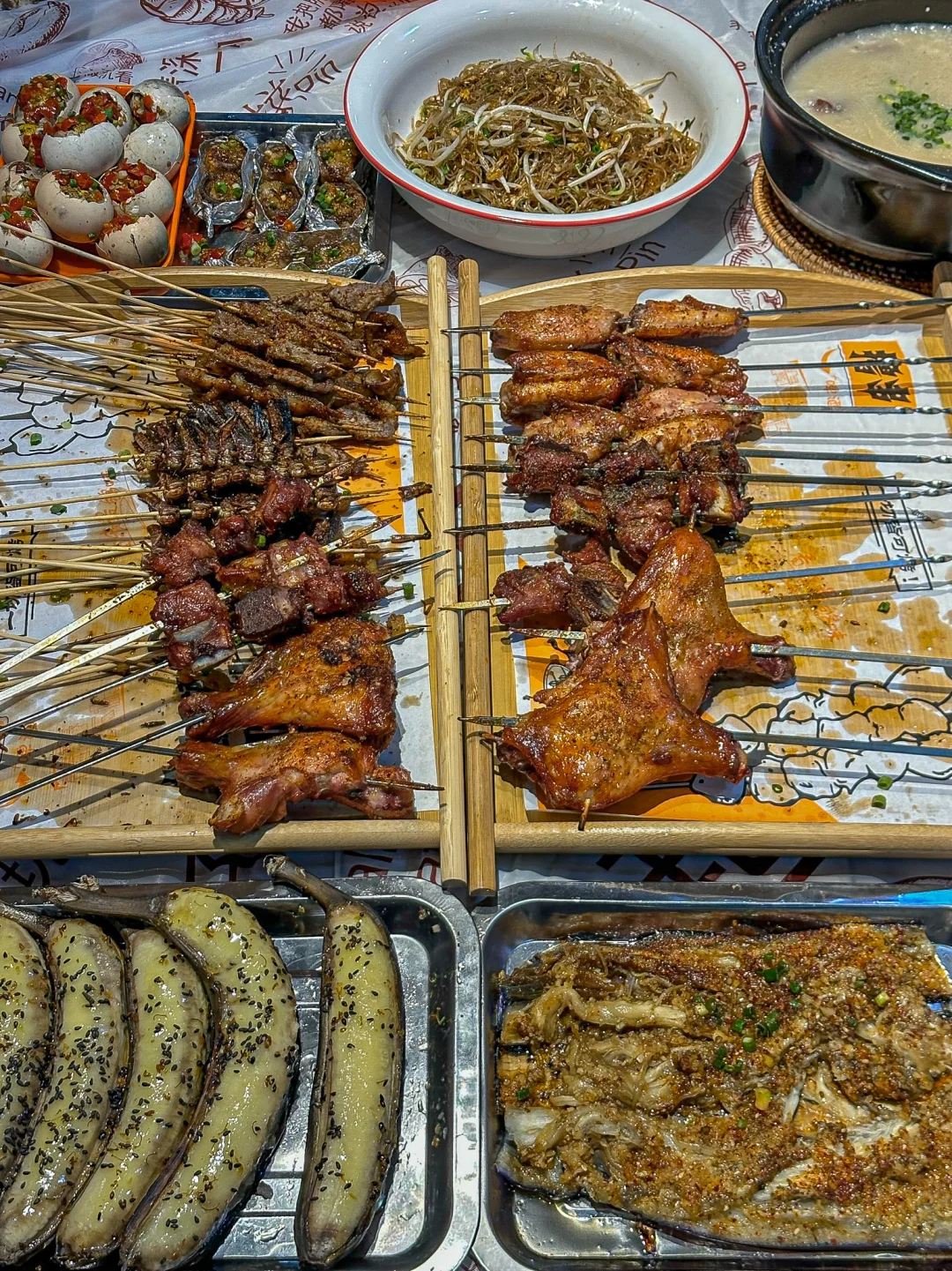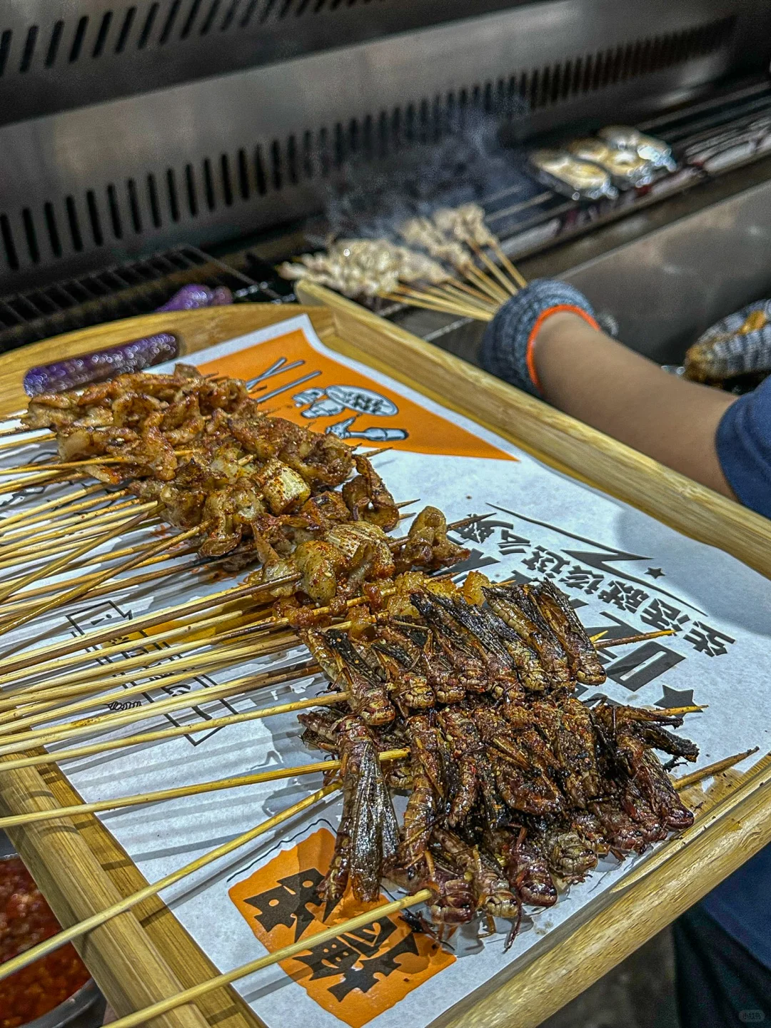 烤毛蛋!!!(也叫活珠子)加上剁辣椒香葱和调料品……这味道👅绝了👍 烤蚂蚱🦗慢慢的蛋白质🤩口感是很酥脆的那种!! 淋上了桂花酱的香蕉🍌也是别有一番风味!! 然后像基础的牛肉、排骨、五花肉、牛肉也好好吃🤤 论吃🍽️果然还得是我大衡阳啊!!👍