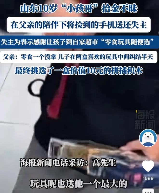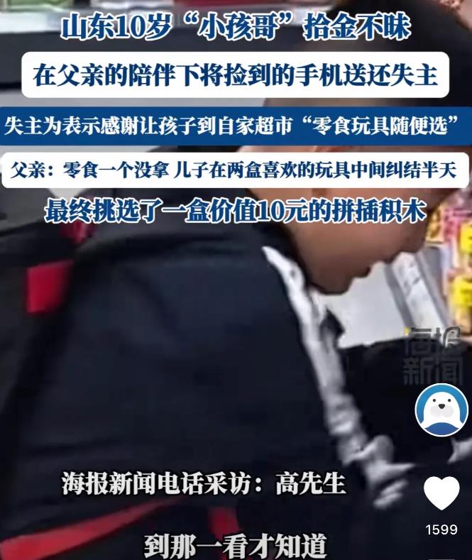 山东潍坊,一10岁男童捡了一部手机,联系上失主后,男童和父亲一起将手机送回给了失主,没想到失主开了一家超市,为了表示感谢,失主让男童到店里零元购,结果男童的做法让人感慨小孩子家教太完美了。