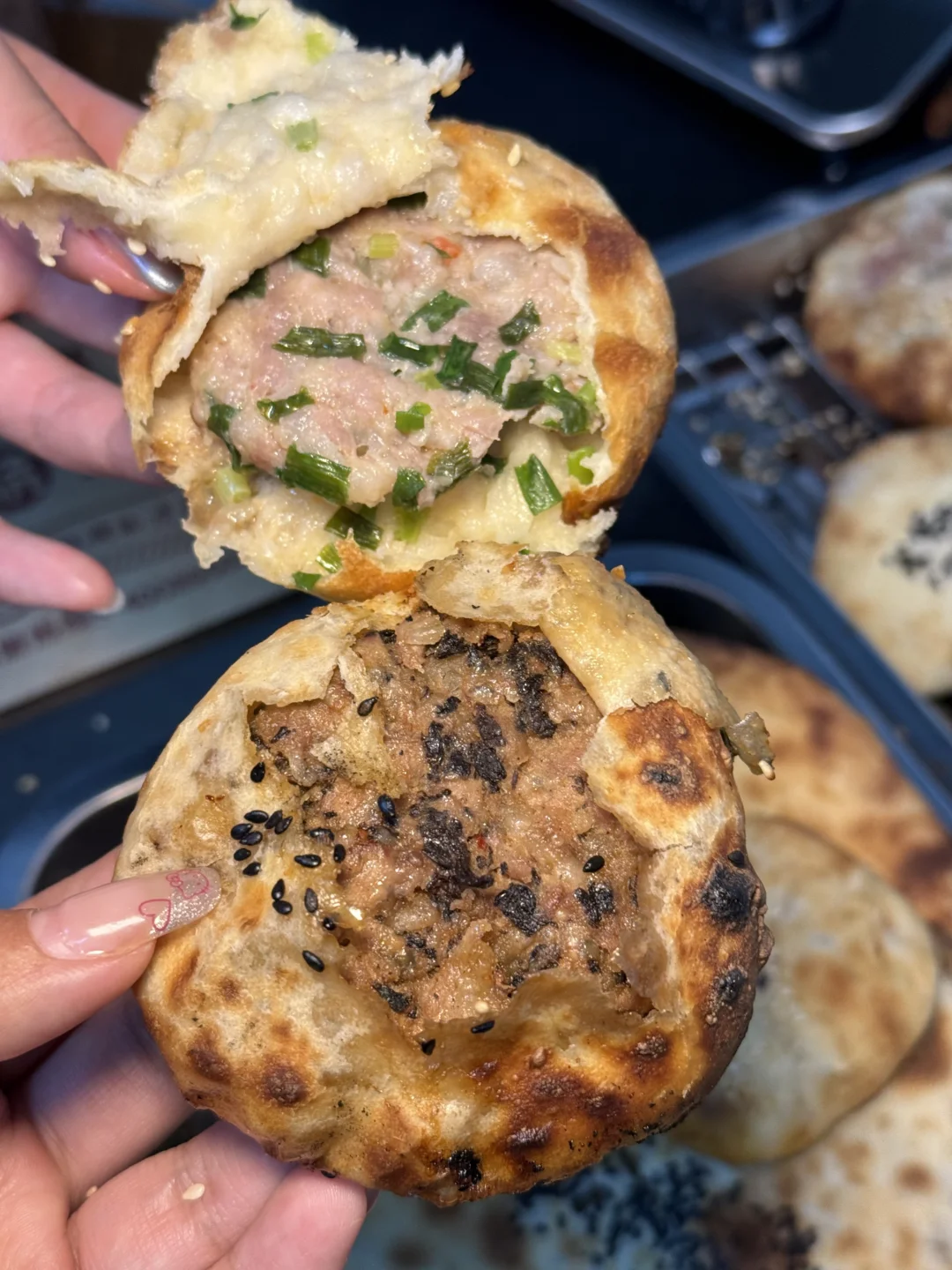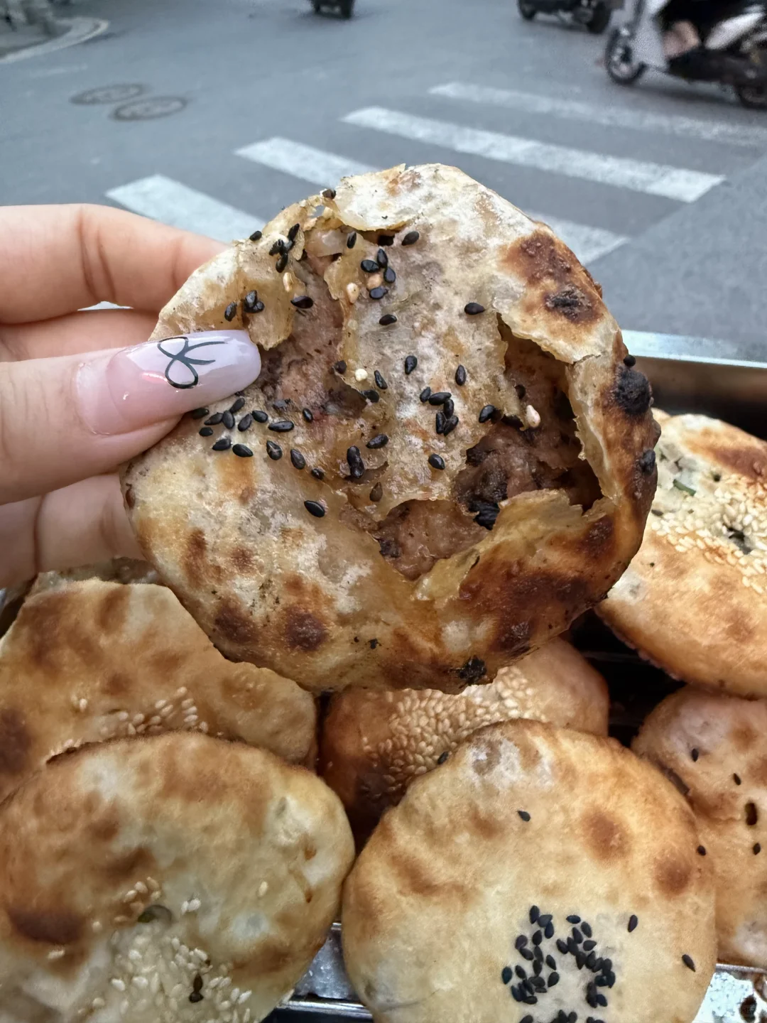就在1912对面,3.9r两个的鲜肉烧饼,现烤的真的巨好吃,有梅干菜和小葱两种口味,我超爱梅干菜的。