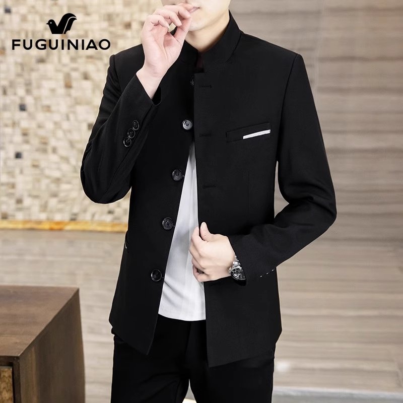 富贵鸟休闲西服男士潮流商务立领中山装秋季新款卡其小西装外套男
