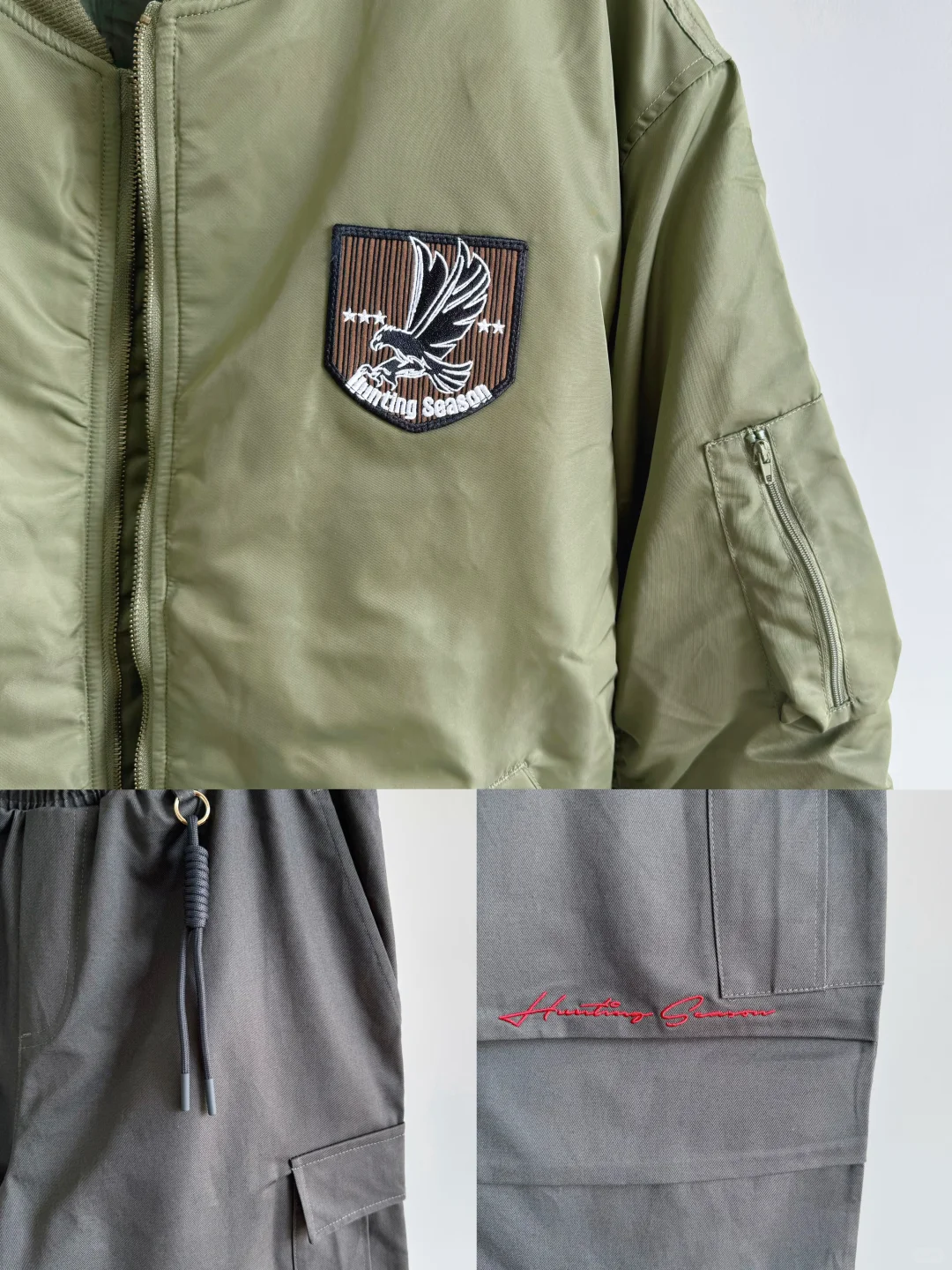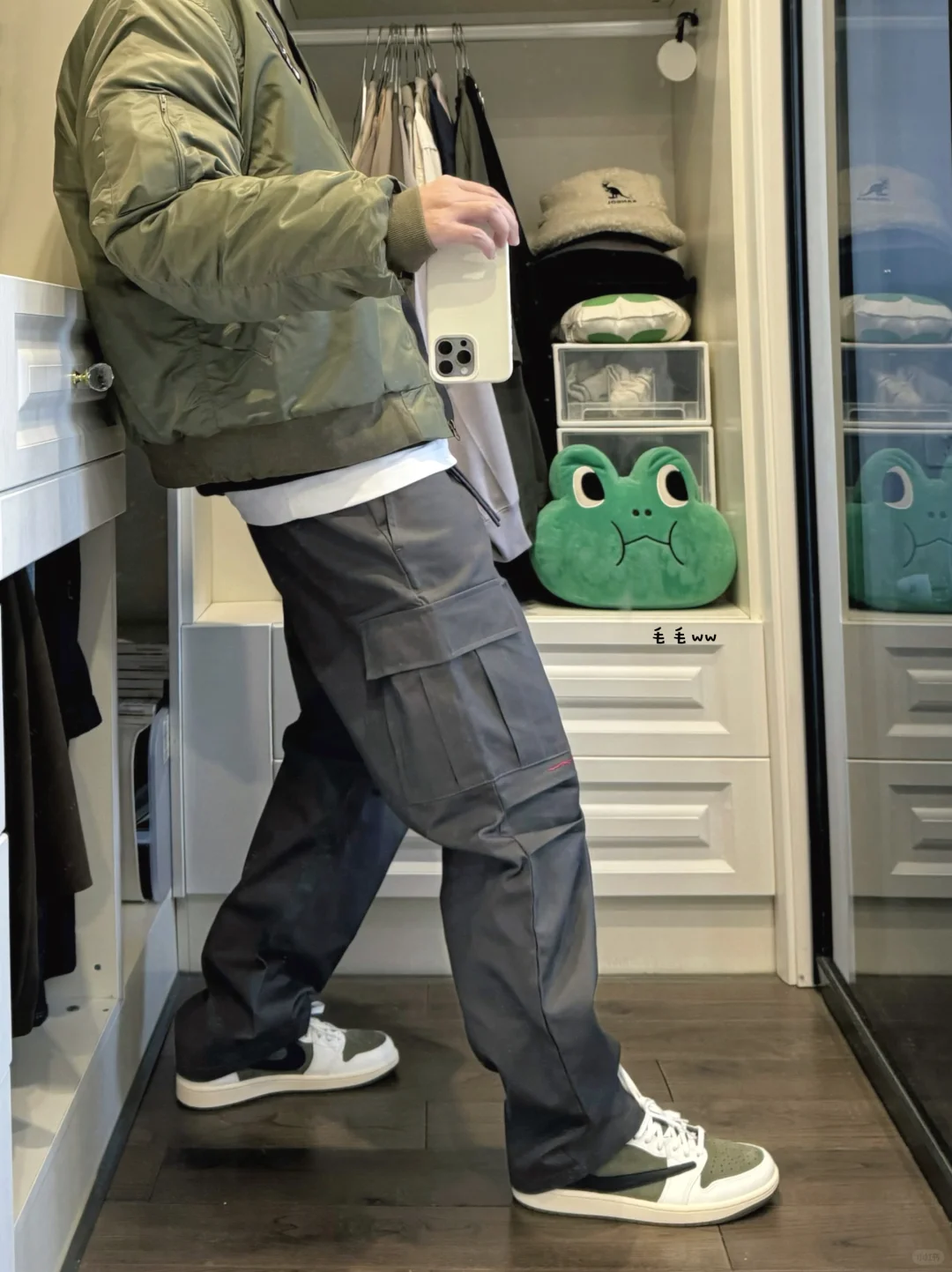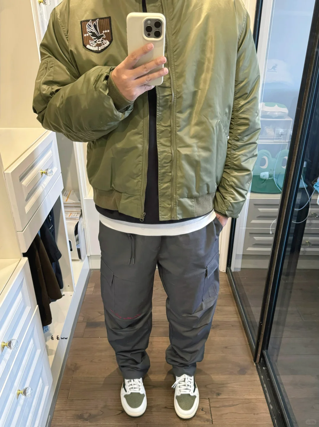 -选择Bomber的配色,军绿应该是不可忽略的,整体硬朗的风格,与工装裤适配 . -区别以往常用的黑色系,深灰色高级感十足,黑白灰三色叠穿的效果非常耐看 . —————— . ✏️本人178cm75kg 球鞋尺码265mm(正常EU42) . 💭以上均为我个人观点,不喜勿喷,欢迎讨论
