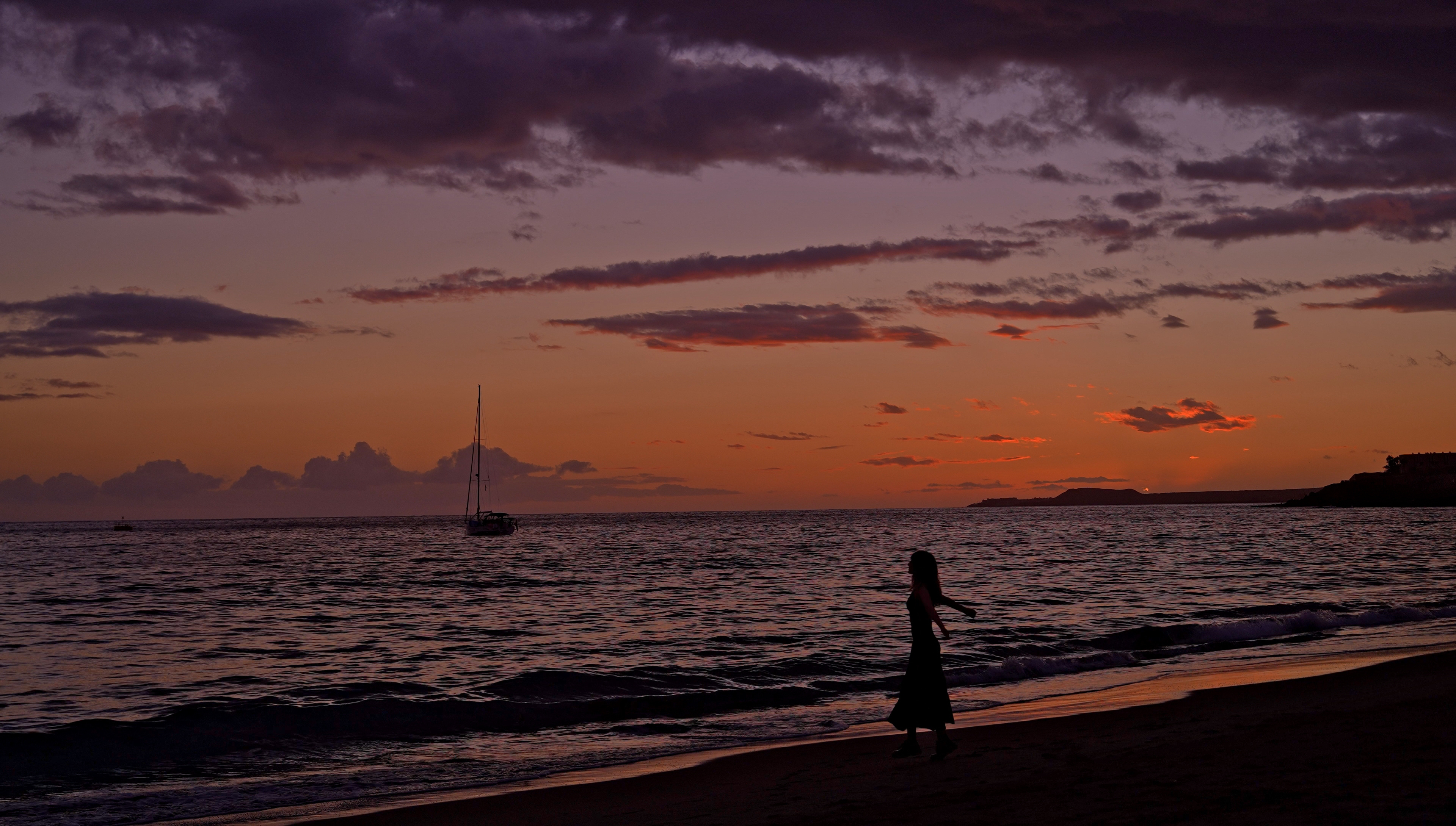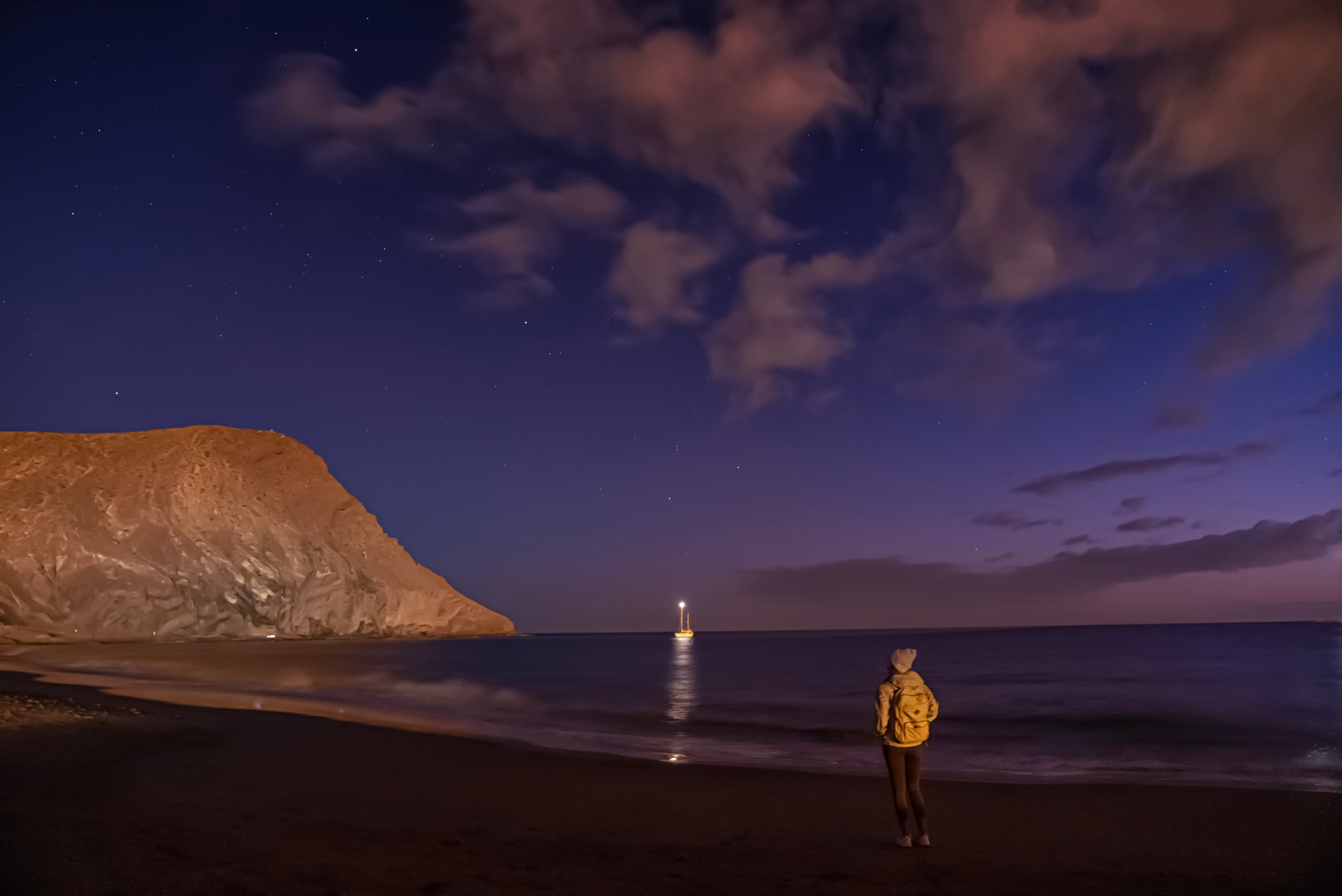 漂浮在大西洋,置身三毛笔下的“丹娜丽芙”日落后绝美的紫色晚霞组成的梦境。重返Tenerife特内里费岛屿被天空极高饱和度光线惊艳,白昼的落幕之后,云层遮住了狮子座轩辕十二、轩辕十四与月牙组成的“星月给人类最可爱的微笑”,对着海水不断拍打礁石激起层层白色的泡沫凝视了许久…