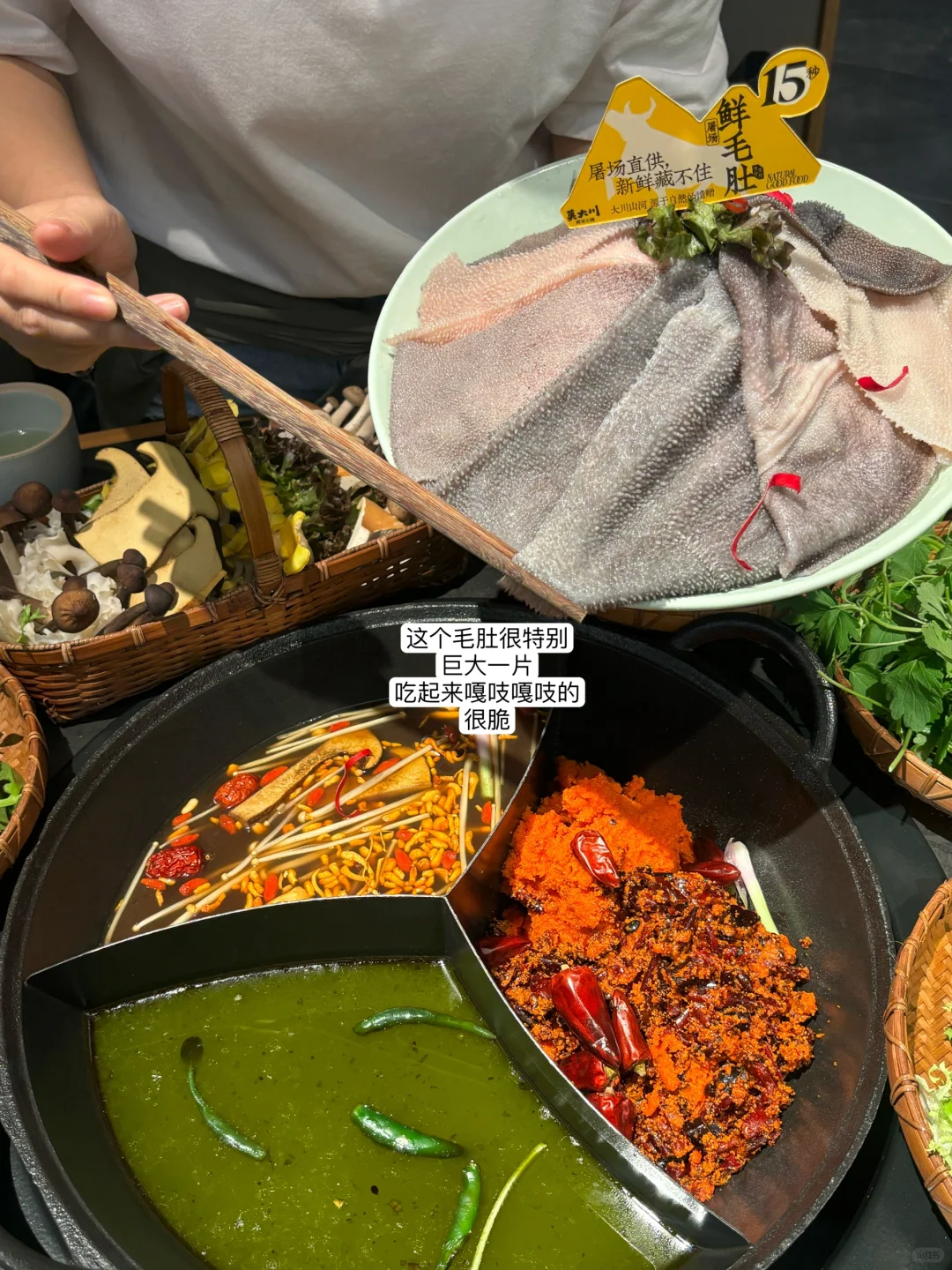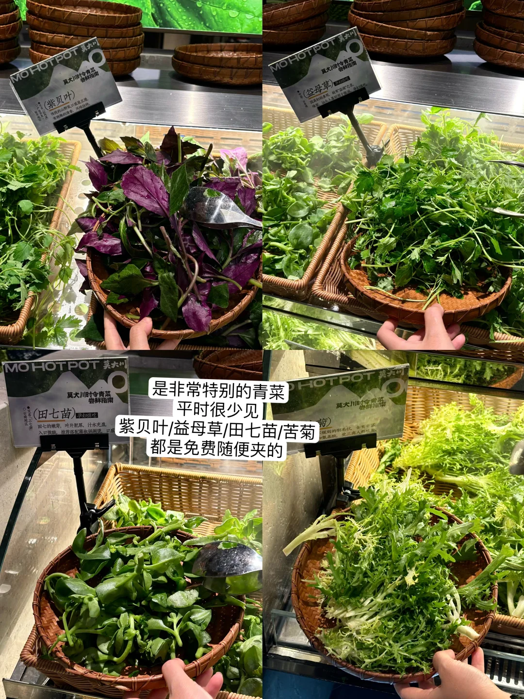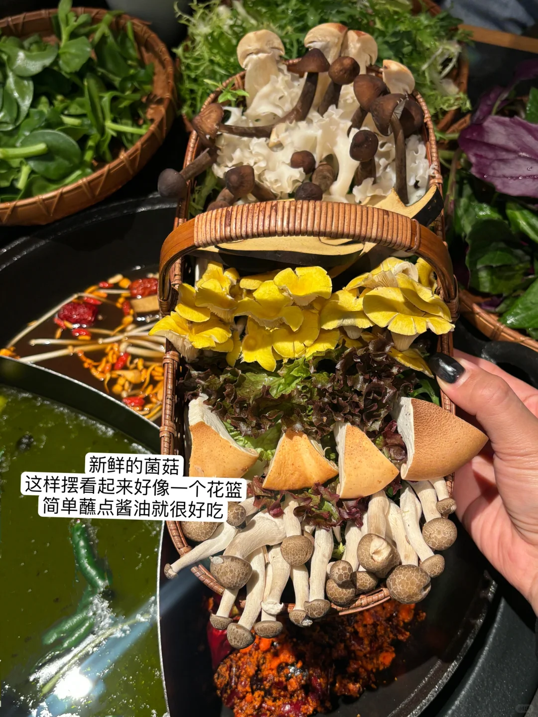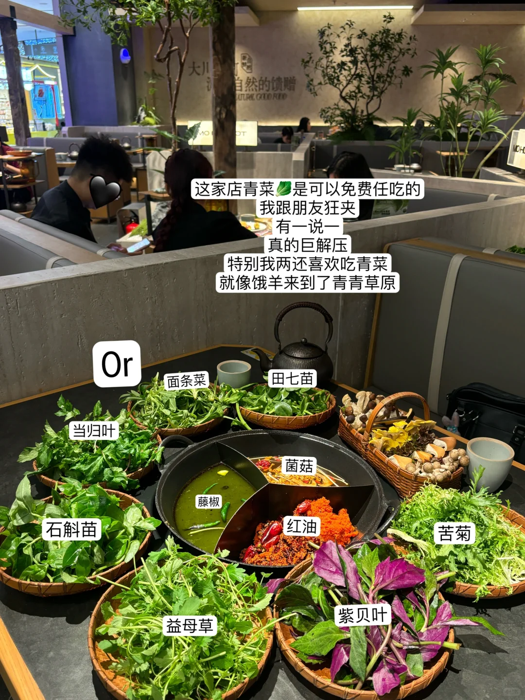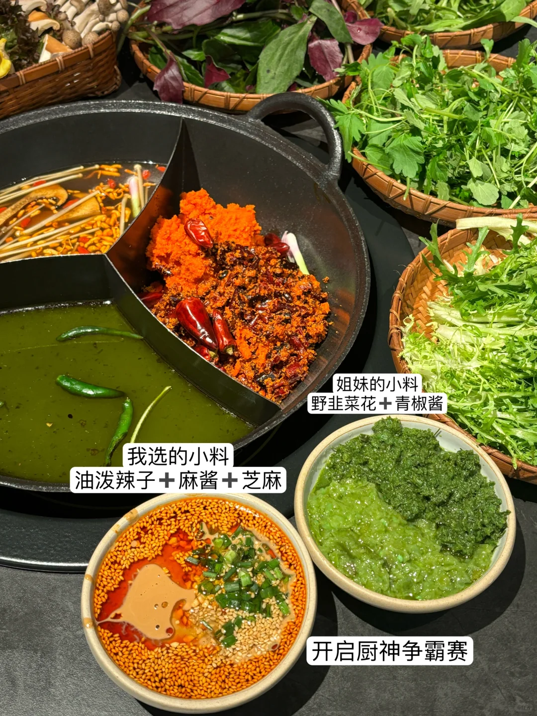青!菜!任!吃 还是十分稀缺那一挂的 我狂炫!!!😭 然后小料台有十几种蘸酱可以自己搭配 我的配方:麻酱➕油泼辣子➕芝麻 蘸牛肉巨香🐂 这家锅底有三个口味(藤椒/红油/菌菇 提供的食材也新鲜 个人感觉确实是火锅届的王👑 锅底/蘸料/食材/服务拉满!!!