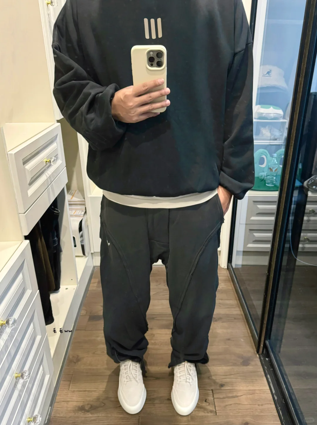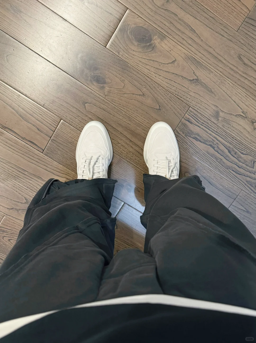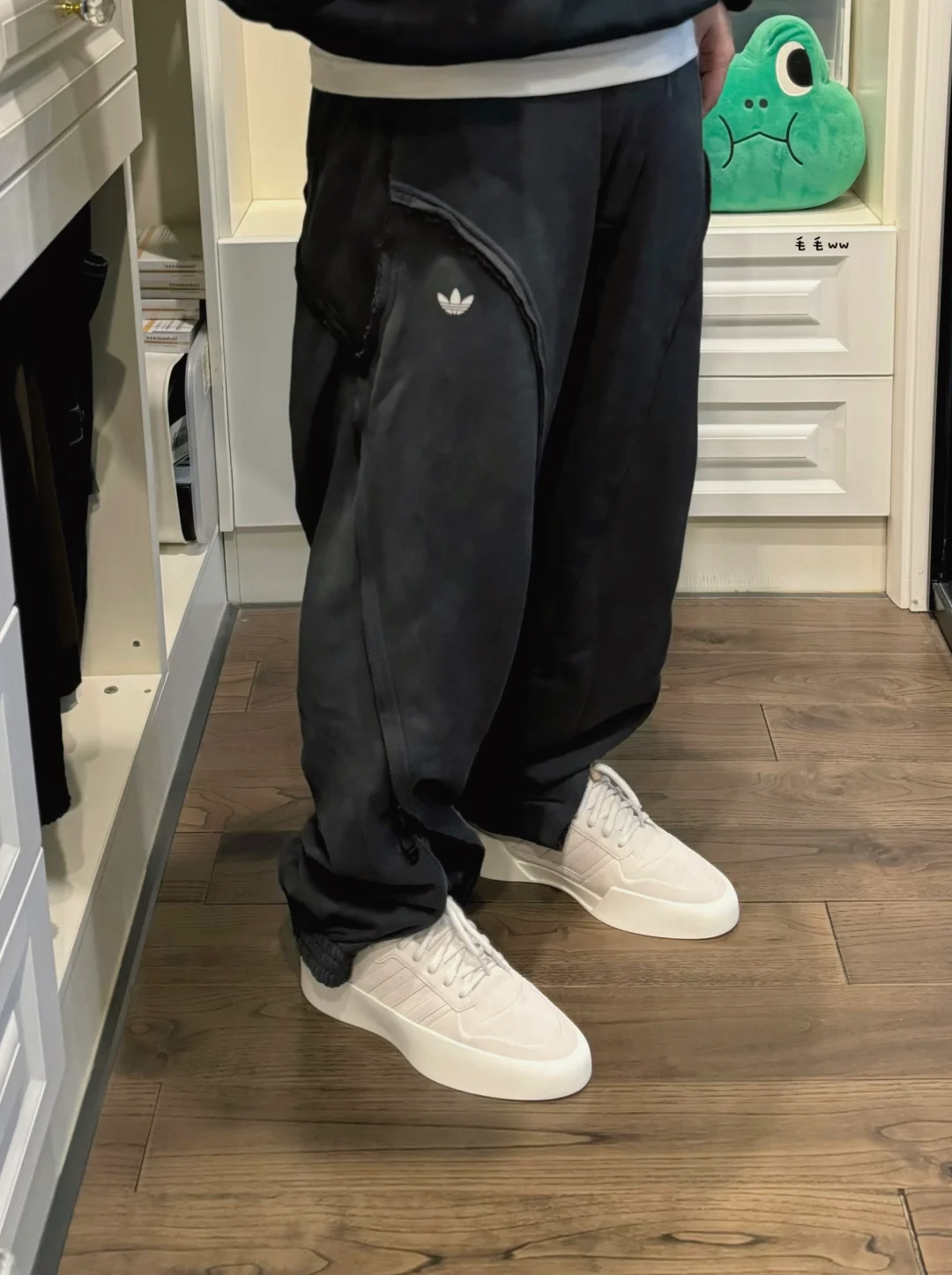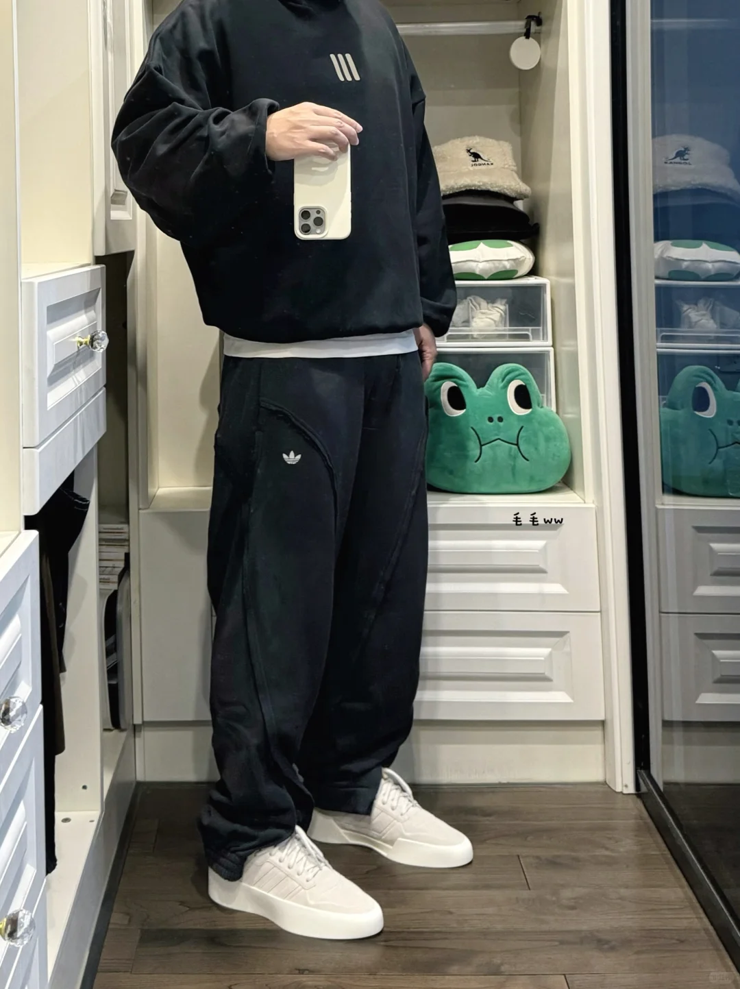 -卫裤穿过太多,但这条够特别;正常束口状态,侧拉链拉开后变成阔腿,半拉开跟全拉开效果也不同;相较于普通卫裤,可玩性更高 . -大家熟悉的侧面logo三条杠,巧妙地藏在拉链拉开后的内侧,整体设计低调不张扬反而讨喜;实物黑色偏蓝灰,搭配黑白灰都没问题 . —————— . ✏️本人178cm75kg 球鞋尺码265mm(正常EU42) . 💭以上均为我个人观点,不喜勿喷,欢迎讨论