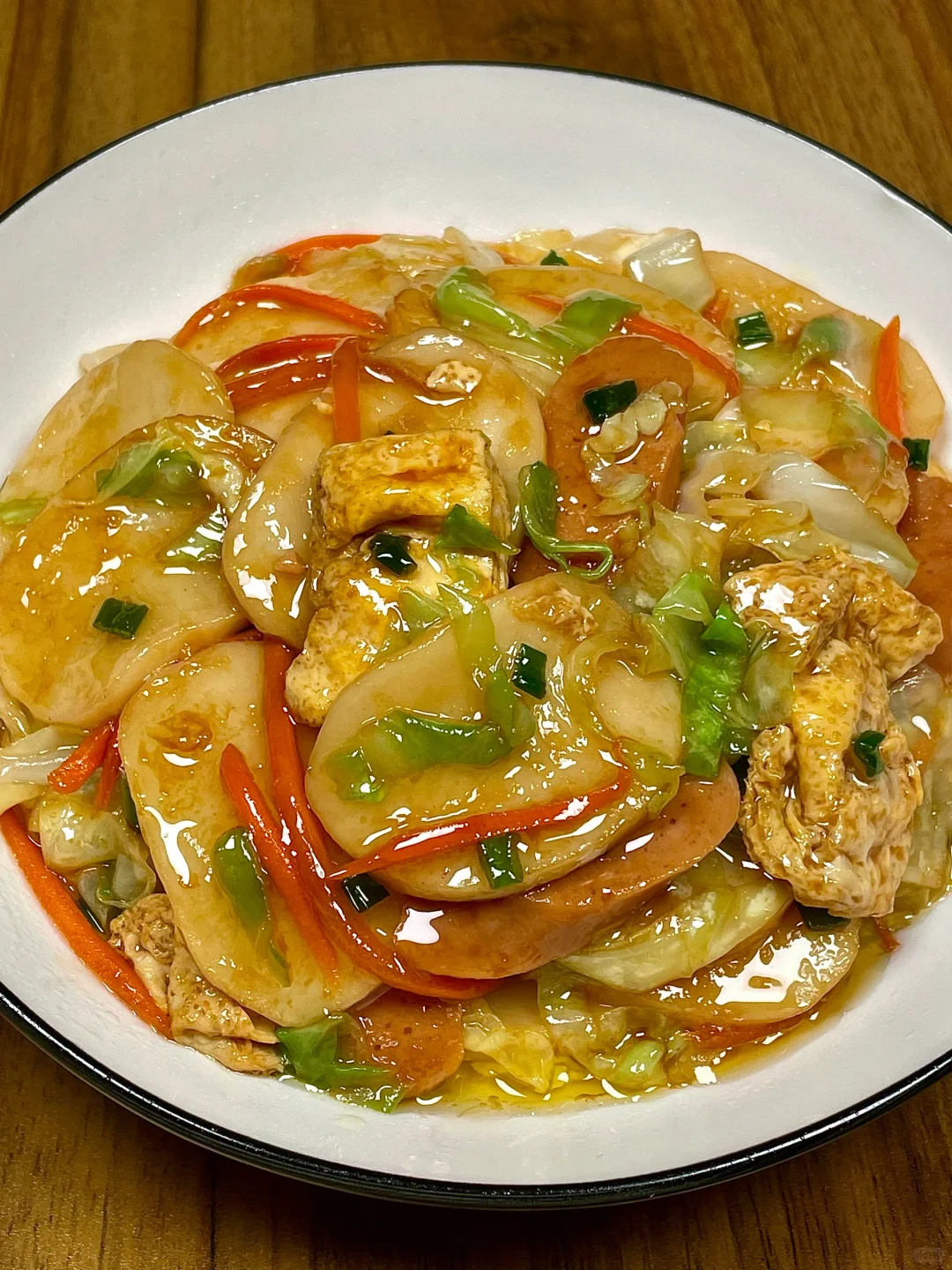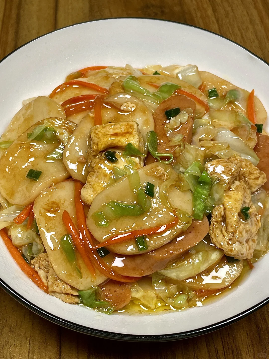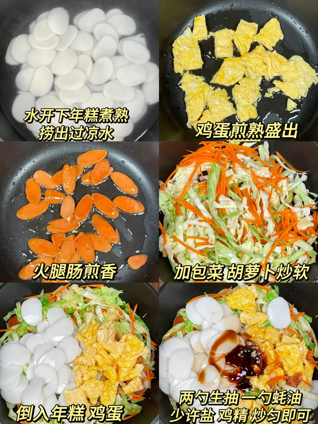 炒年糕这么做真的好好吃哇[色色R]一人炫了一大盘! 糯叽叽的年糕鲜香美味,加了鸡蛋和火腿绝绝子!巨香巨好吃[哭惹R]求你们都去做!! [向右R]食材:年糕➕鸡蛋➕火腿➕青菜 [向右R]做法:如图所示!