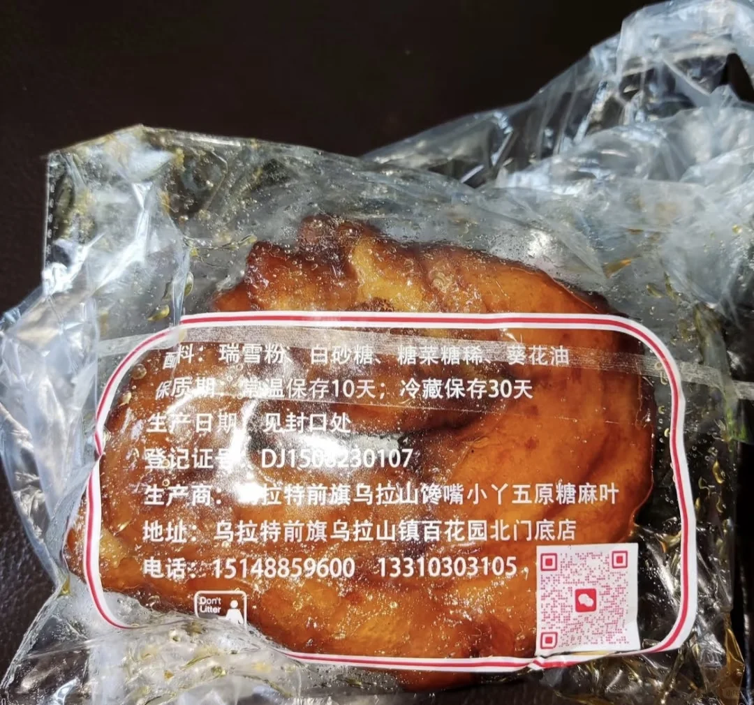 配料表有:瑞雪粉、白砂糖、糖菜糖稀、葵花油,配料表还是很干净的,很有饱腹感,基本上吃上一个就饱了,老人小孩都可以食用。[萌萌哒R]