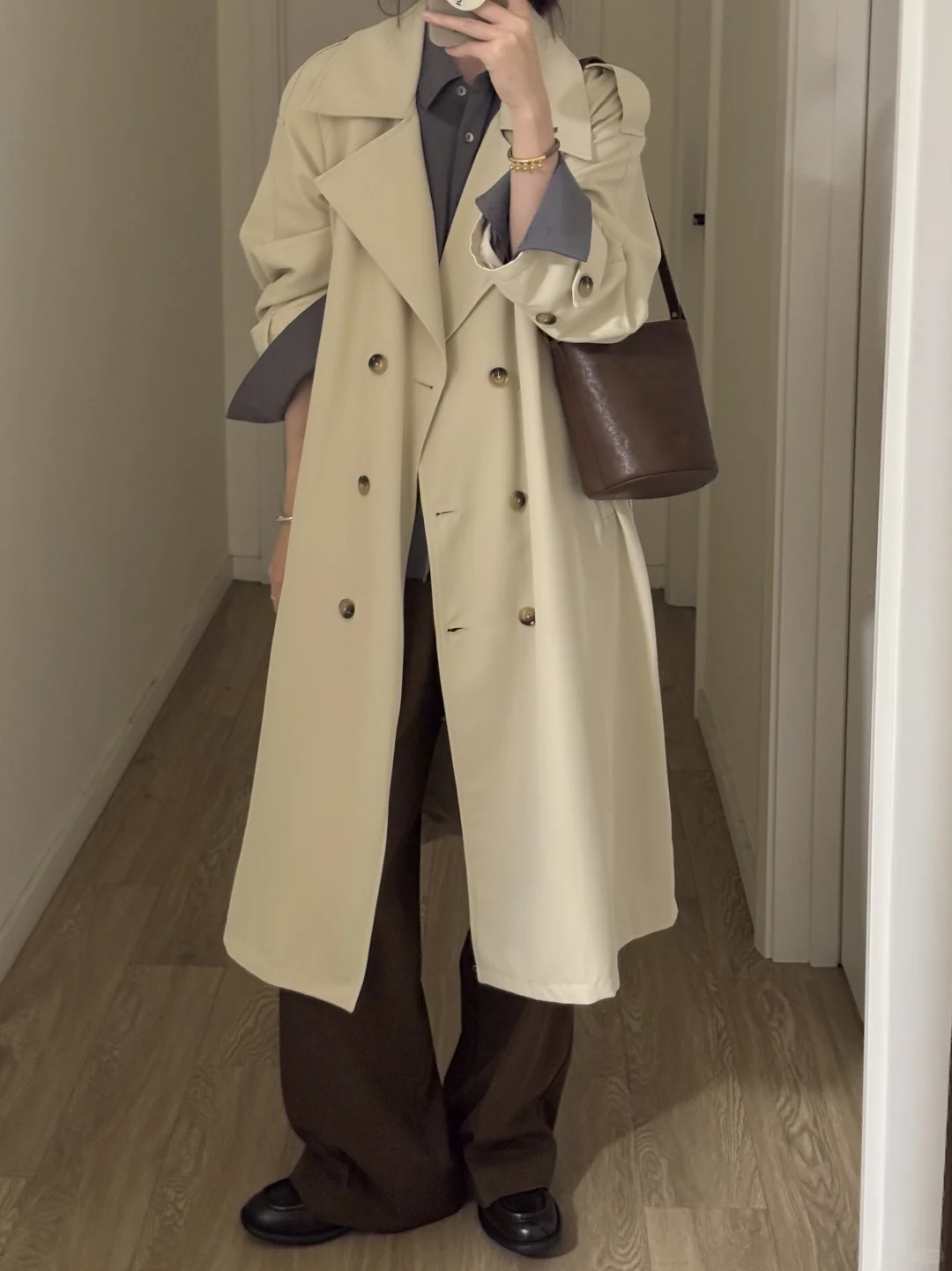 好秋冬韩系复古杏色风衣叠灰蓝穿衬衫咖裤🫓