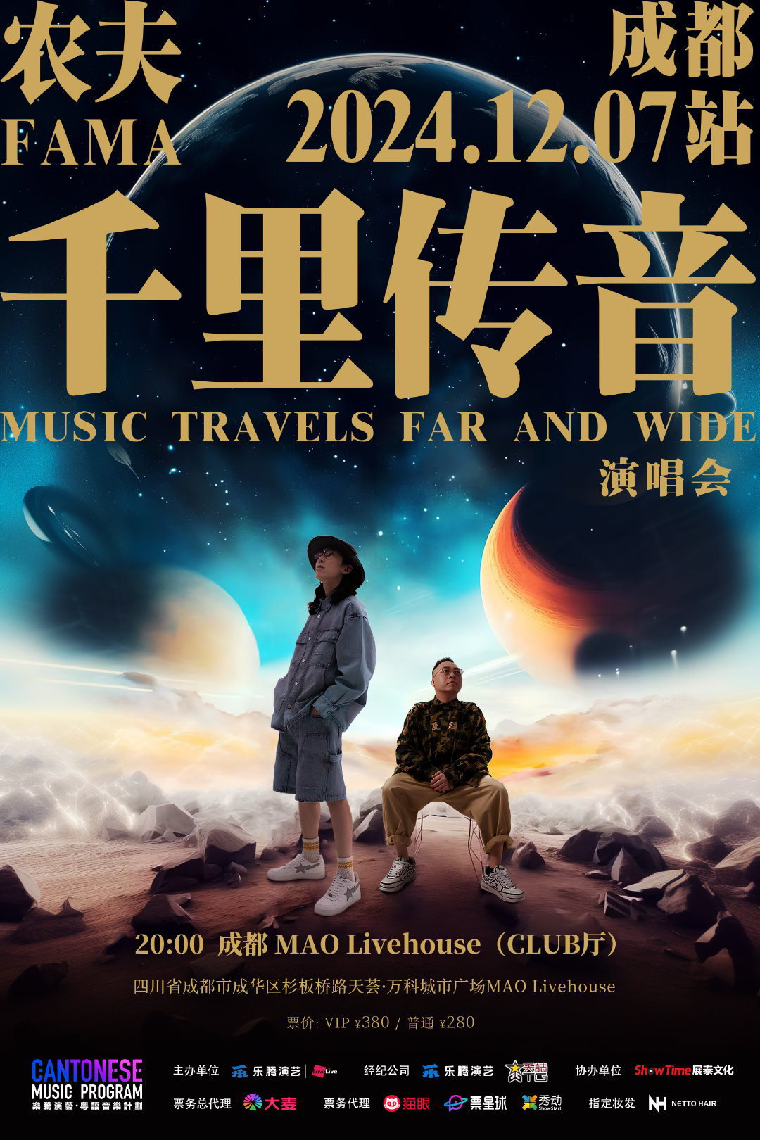 他们是最具代表性的粤语说唱组合之一,曾和方大同、林俊杰、陈冠希等一线明星有过多次音乐合作,他们就是农夫!12月,他们将首次走出大湾区,跨越千里去到成都上海两城与更多乐迷分享他们的音乐!12月7日成都MAO Livehouse,12月8日上海新歌空间,农夫千里传音,就等你来倾听!#农夫千里传音演唱会#
