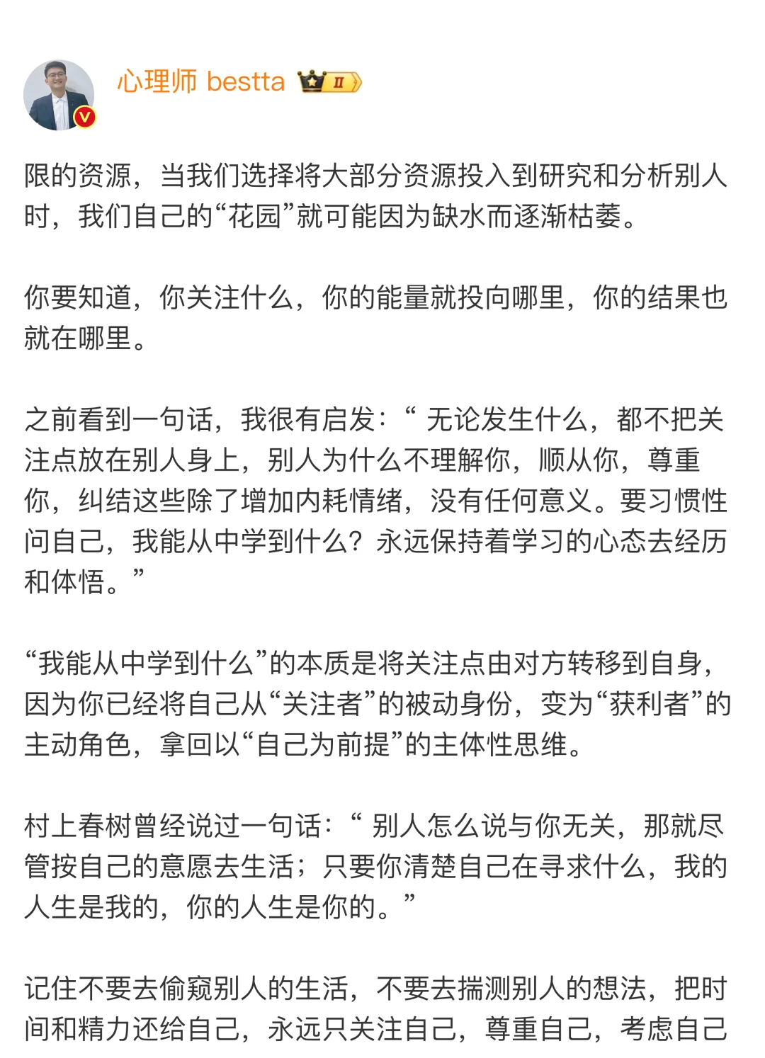 人的心神是极其宝贵的,关注别人的过程中,我们自己就会产生很多想法和情绪,这些都会将原本用于专注自我成长的注意力分散出去,相当于你把能量倾注到别人身上,让自己处于亏空的状态,本质上是没有意义的。