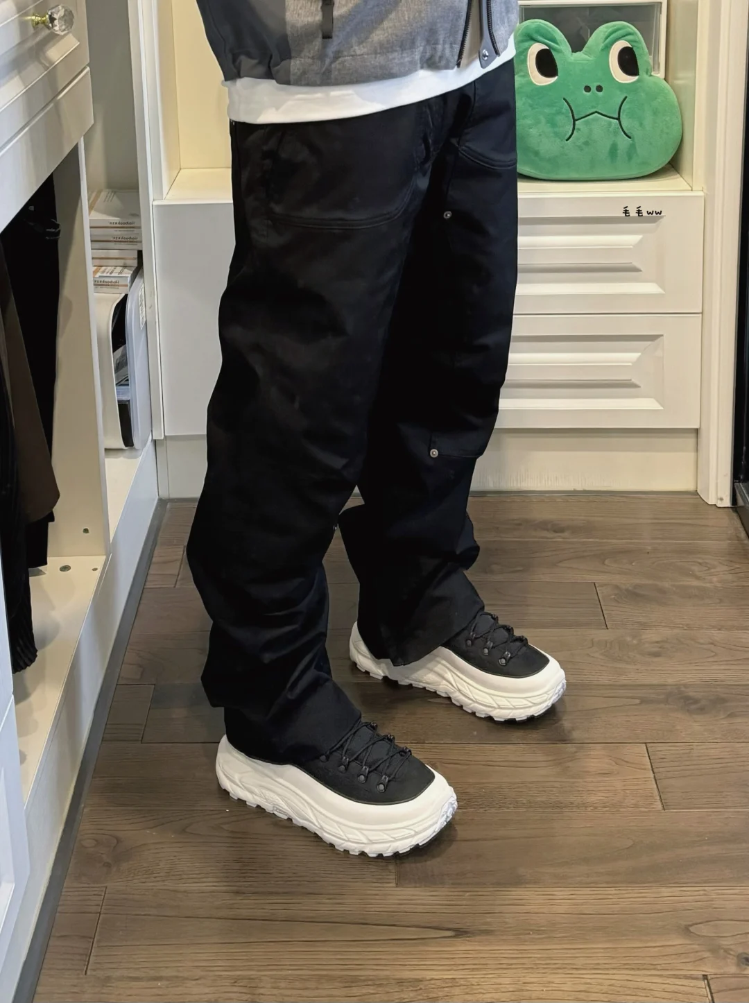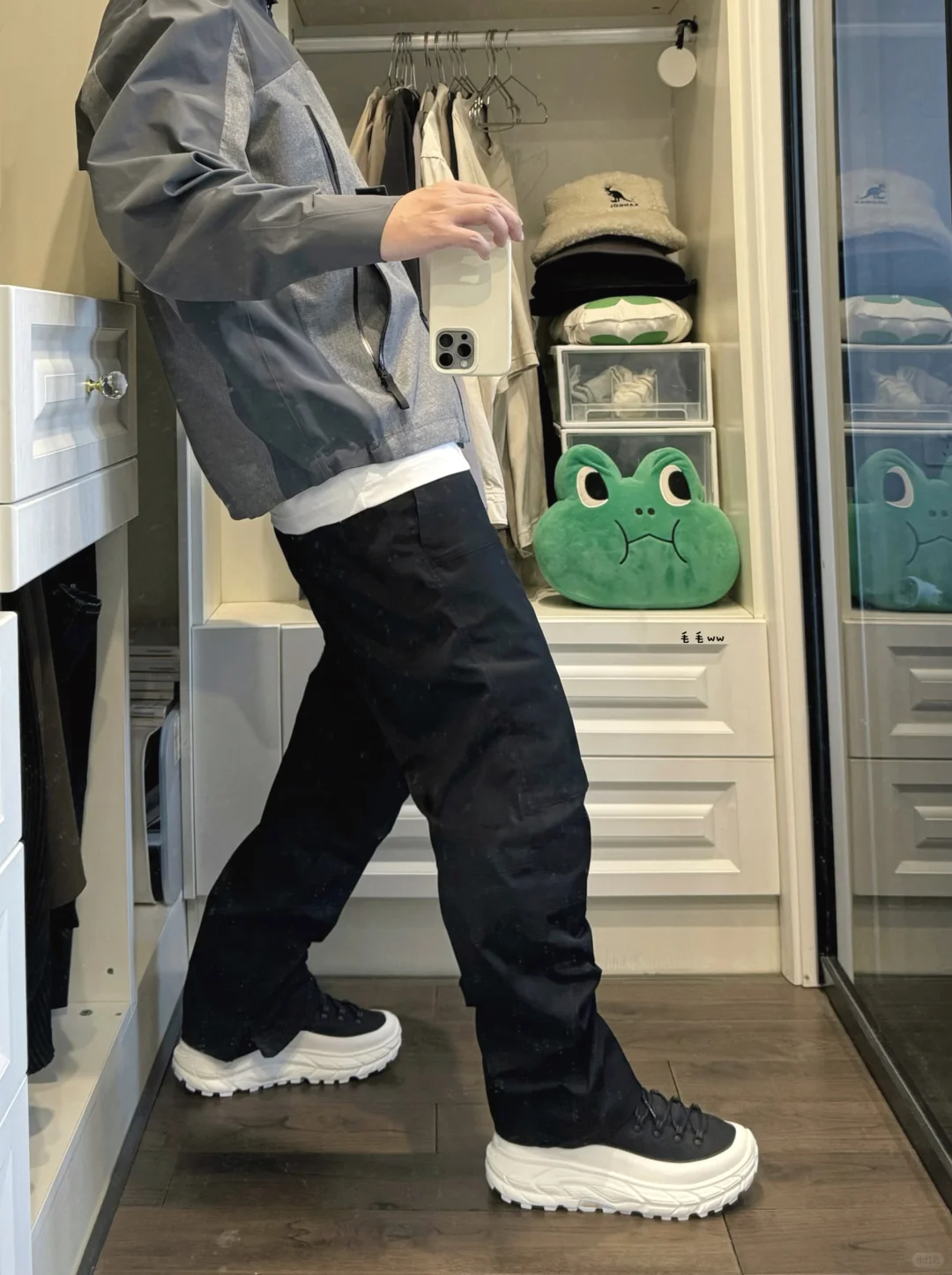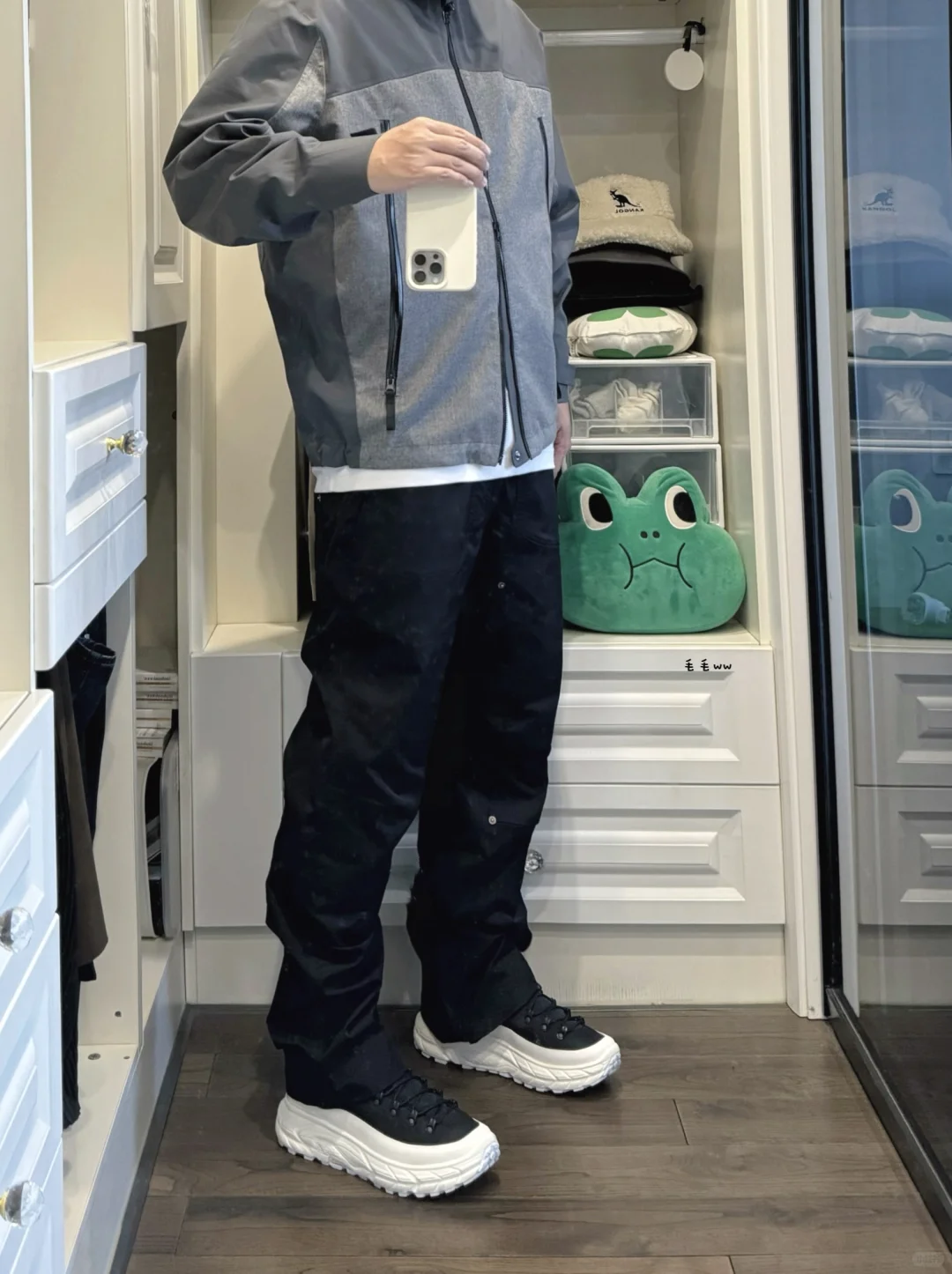 -上一期户外穿搭是灰色格雷系,本期回归极简三色,秋冬季的“常客”,黑白灰简洁又有效的穿搭 . -冲锋衣大拉链内层分隔两个口袋,很满意这个的小细节;工装裤裤脚的拉链瞬间把可玩性提升 . —————— . ✏️本人178cm75kg 球鞋尺码265mm(正常EU42) . 💭以上均为我个人观点,不喜勿喷,欢迎讨论