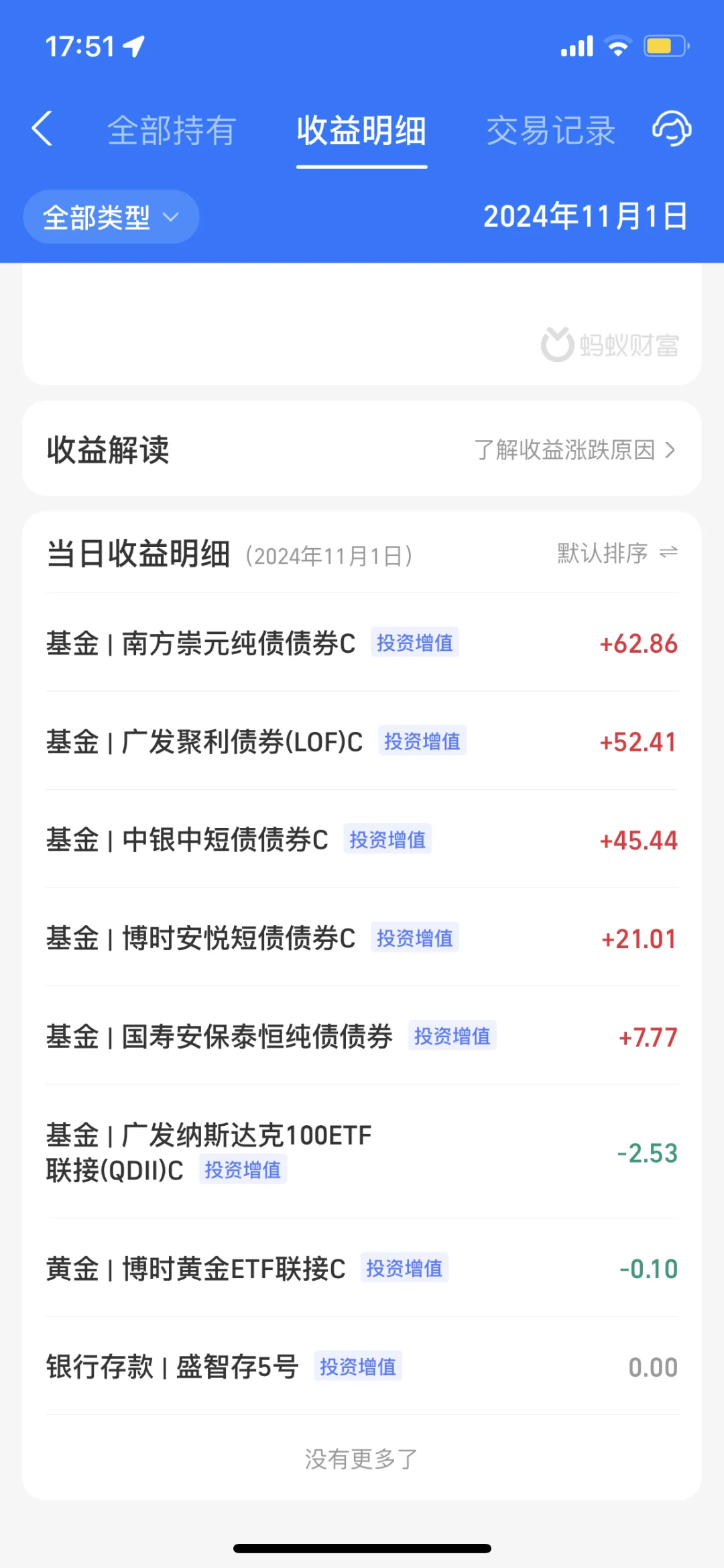 我的理财日记 11月开门红,开心咯~ 总结10月,买博时系列还不错, 发掘一支超稳的债,但是收益少 悲伤的是,重仓的博时裕乾我全抛后, 他就一直涨,总体收益没跟上, 周末吃吃逛逛的底气就看11月了~