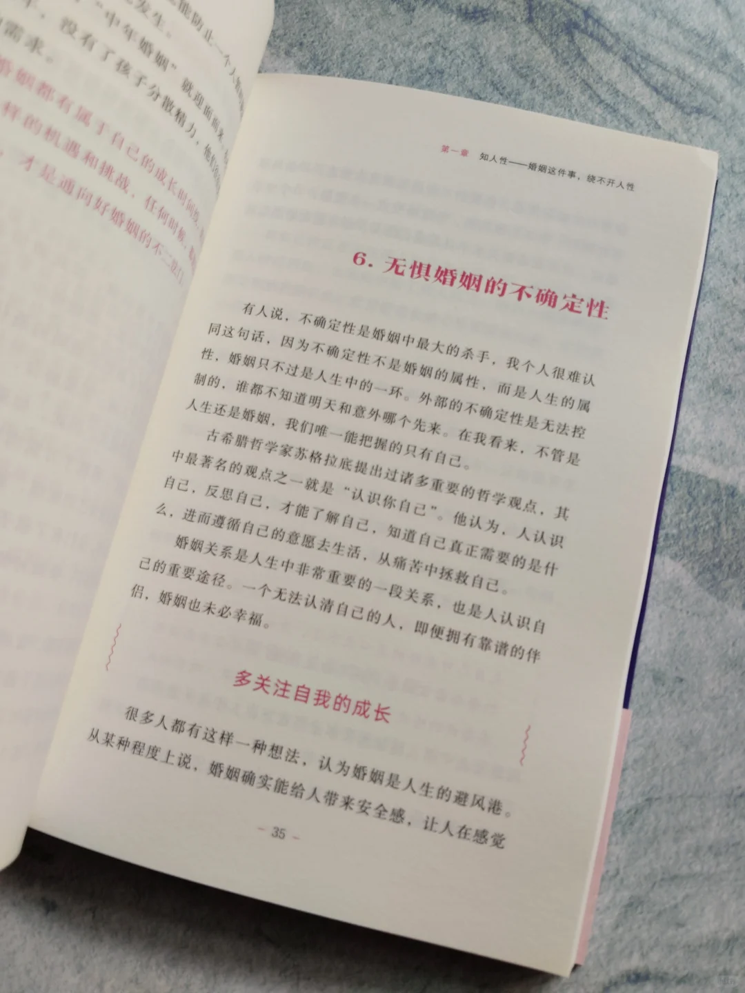 想想经营公司最为关键的因素是什么呢?实就是人,那么婚姻同样如此,我们首先需要洞悉人性。所以在这本书中,作者也就给我们提供了婚姻之中的自私理念。因为所有人都拥有自私的一面,而这部分在婚姻之中必然展现的淋漓尽致,如果不对于这样的一种理念有所应对,必然会陷入失望甚至绝望之中