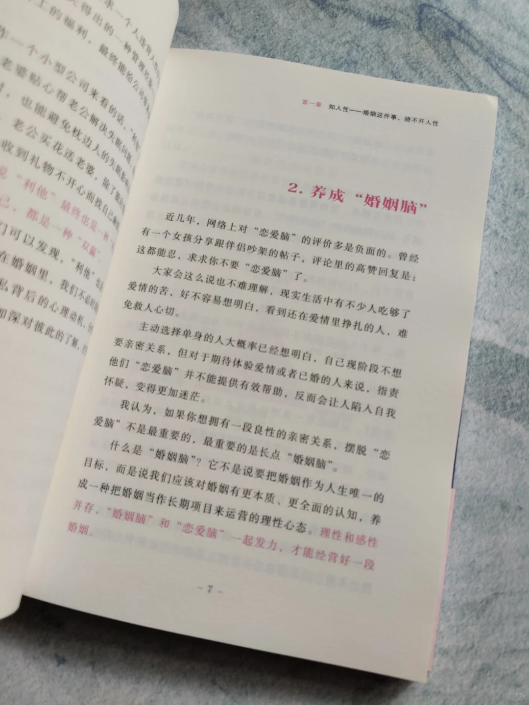 这时我们就应该拥有着超出恋爱脑的婚姻脑。婚姻脑是恋爱脑的延续和发展,让爱情得以延续。具体怎样养成婚姻脑呢?这就需要我们看清爱情的真相,需要我们明确婚姻之中的好处和风险,需要我们对于婚姻的底色有着基本的认知。而这本书中的所有内容其实都是为我们拥有更强大婚姻脑所准备