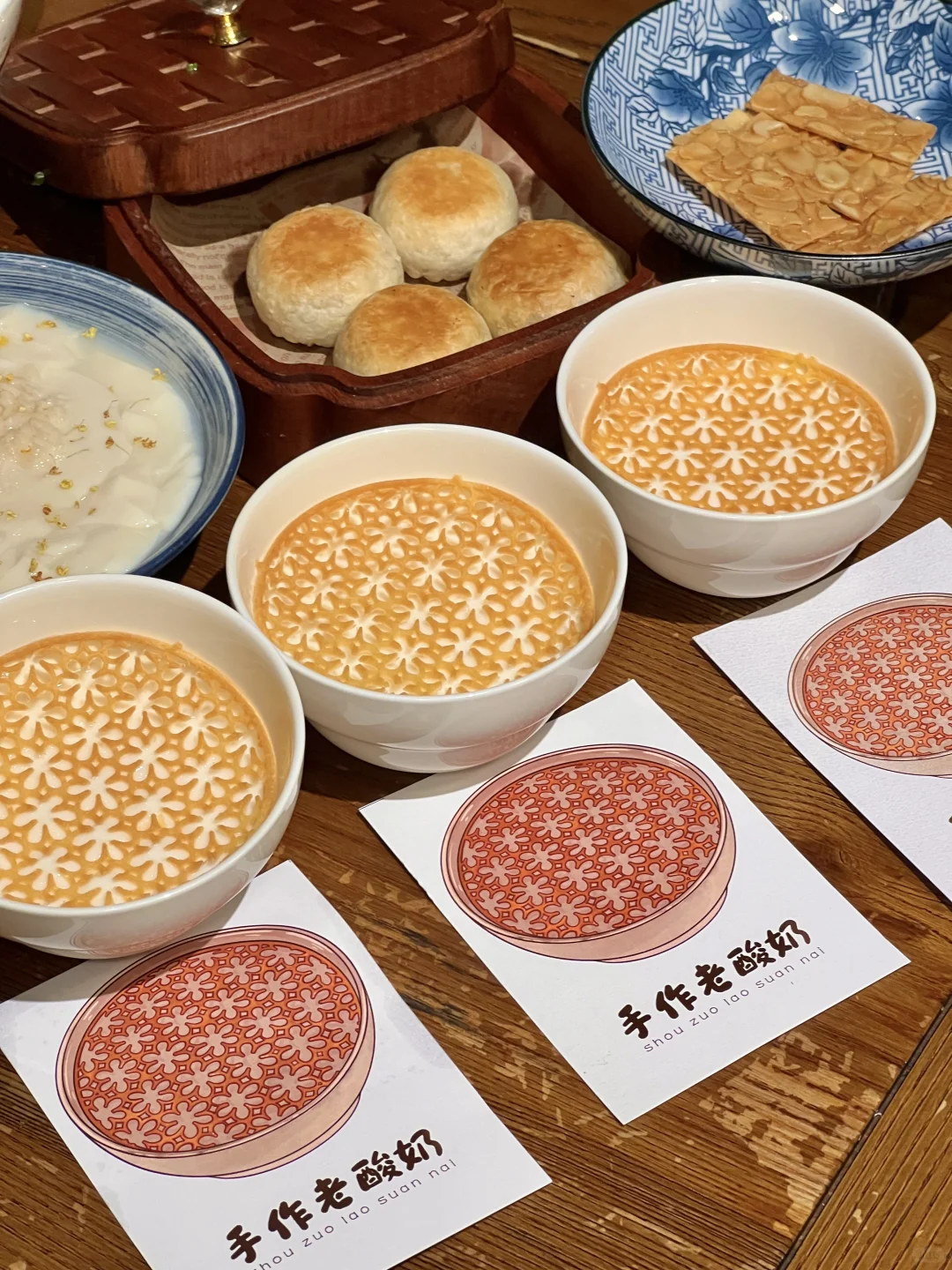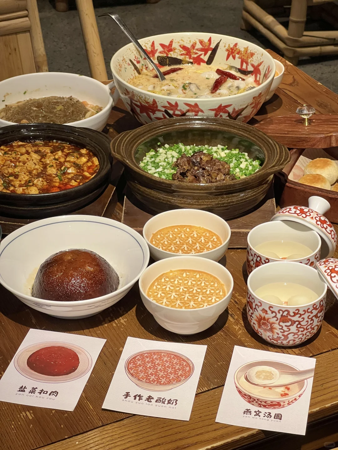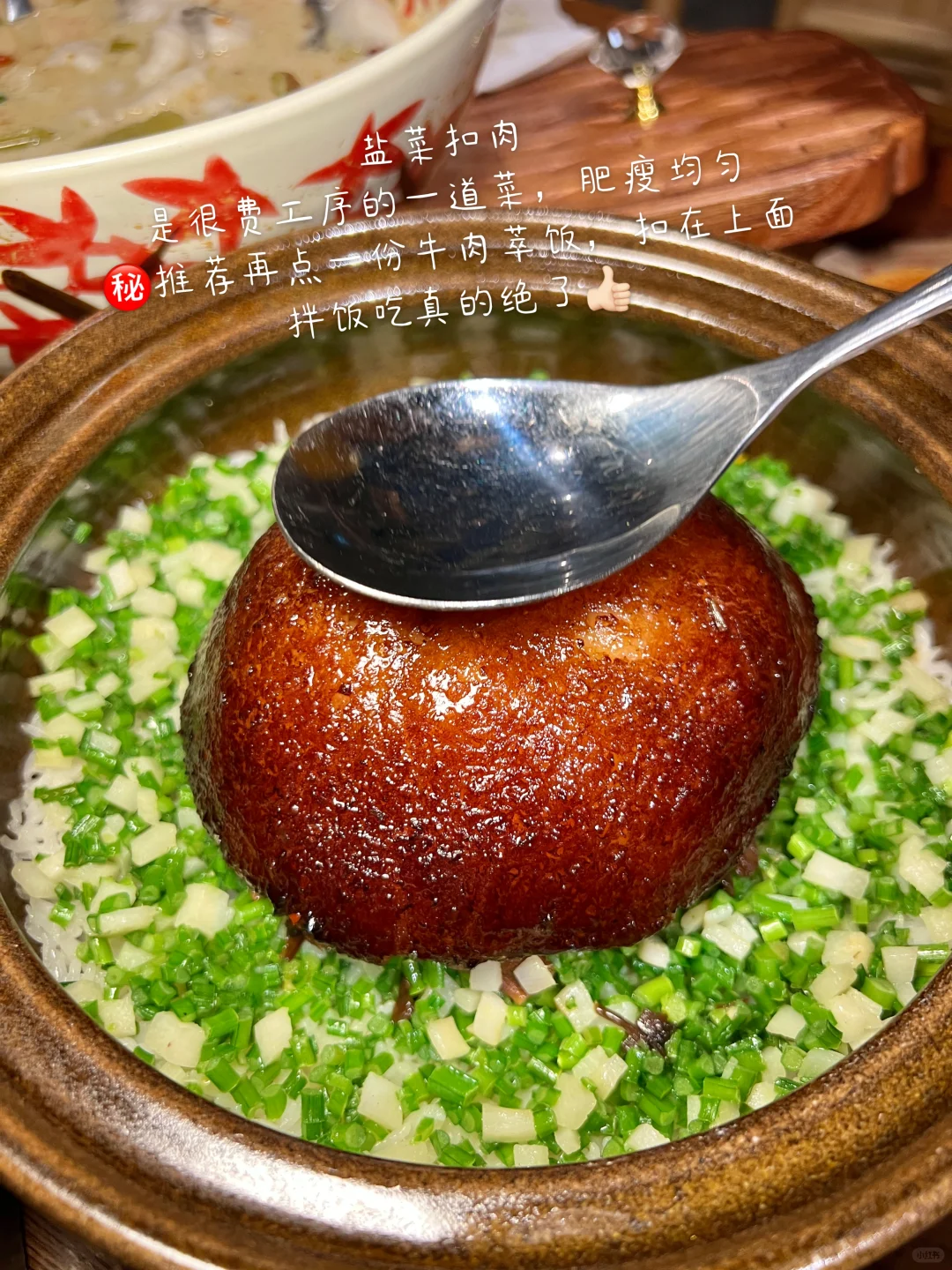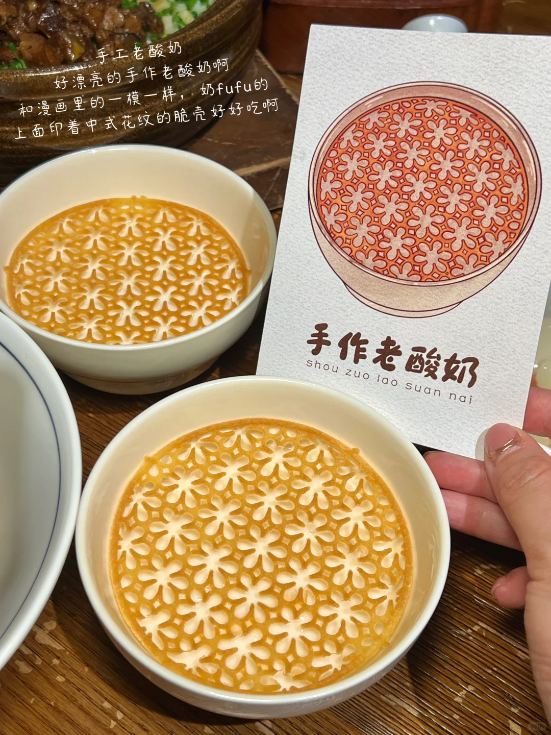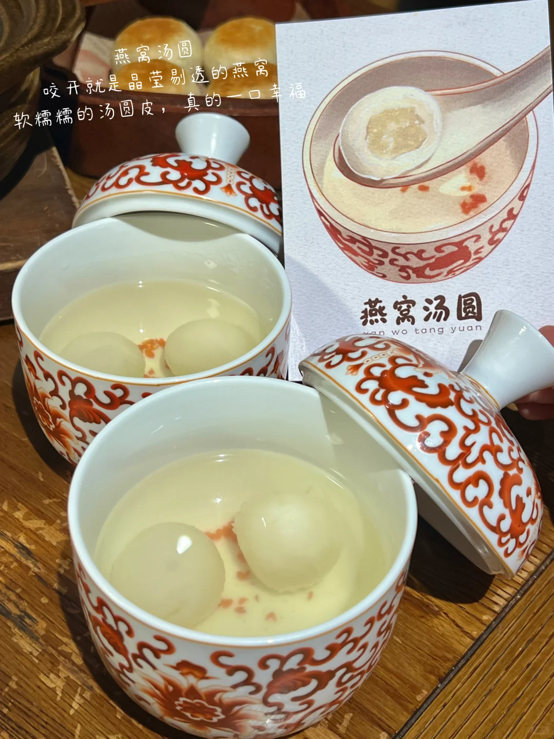 都是吃过很多次的菜品 可以直接码住不踩雷哦~ 1️⃣手工老酸奶 好漂亮的手作老酸奶啊 和漫画里的一模一样,奶fufu的 上面印着中式花纹的脆壳好好吃啊 2️⃣燕窝汤圆 咬开就是晶莹剔透的燕窝 软糯糯的汤圆皮,真的一口幸福🥰 3️⃣盐菜扣肉 是很费工序的一道菜,肥瘦均匀 ㊙️推荐再点一份牛肉萃饭,扣在上面 拌饭吃真的绝了👍🏻 这一口只有江浙沪的家人懂啊 ❗️他家饭点满座,建议还是早点去哦