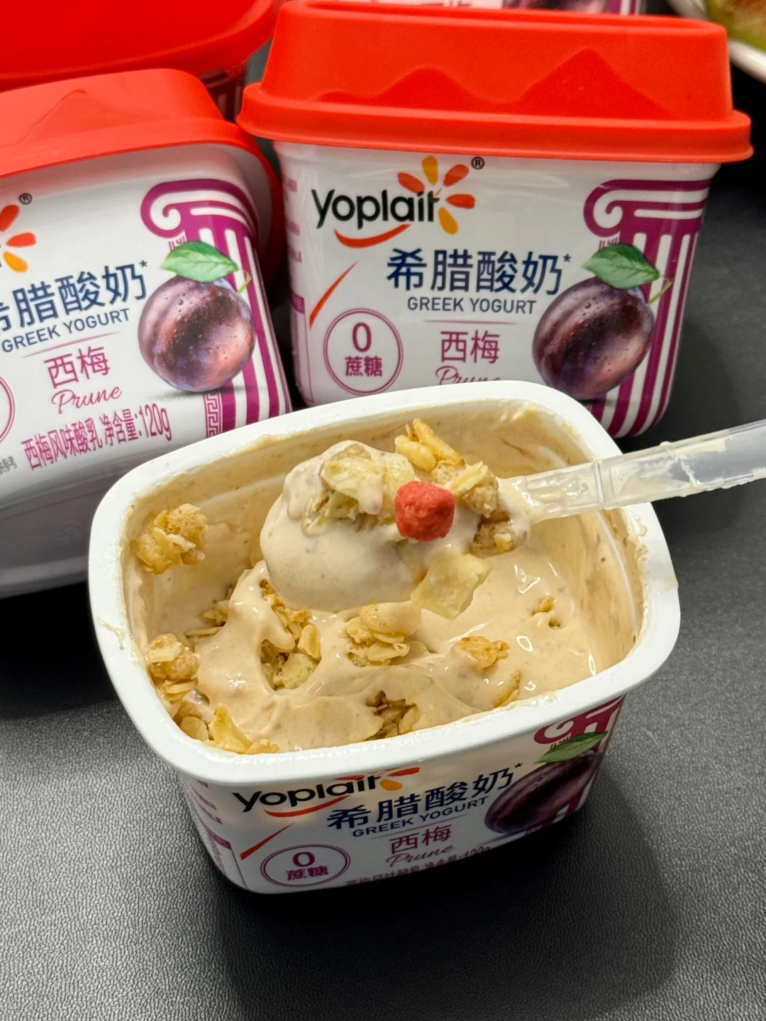 晚上饿了去楼下商店逛逛 发现很喜欢的 优诺希腊酸奶出了新的味道 西梅味的 小小的一杯解馋刚好 0蔗糖超低卡 当宵夜吃起来也没负担 👻 入口口感醇厚丝滑 奶香浓郁 还贪吃的DIY 了一下 加点麦片 好吃好吃😋 是0⃣蔗糖的 高蛋白低热量 有身材焦虑的姐妹也可冲