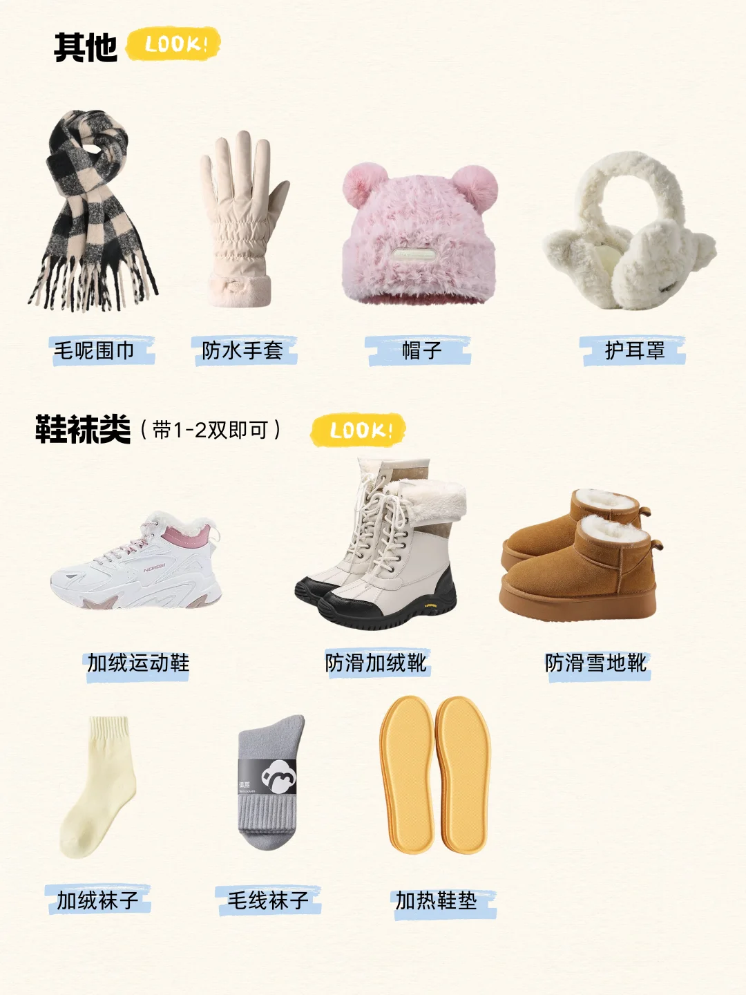 带上厚羽绒服、厚棉服、保暖贴身衣物、棉护膝、手套、围巾、厚帽子、加绒防滑鞋、羊毛袜子
