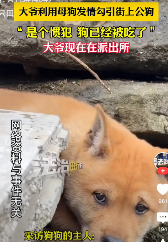 湖北襄阳,一大爷养了一条小母狗,当小母狗处在发情期的时候,大爷带着小母狗外出遛弯,专门去吸引一些公狗后将其带回家,让人无语的是,大爷竟然将带回去的公狗直接吃掉了。