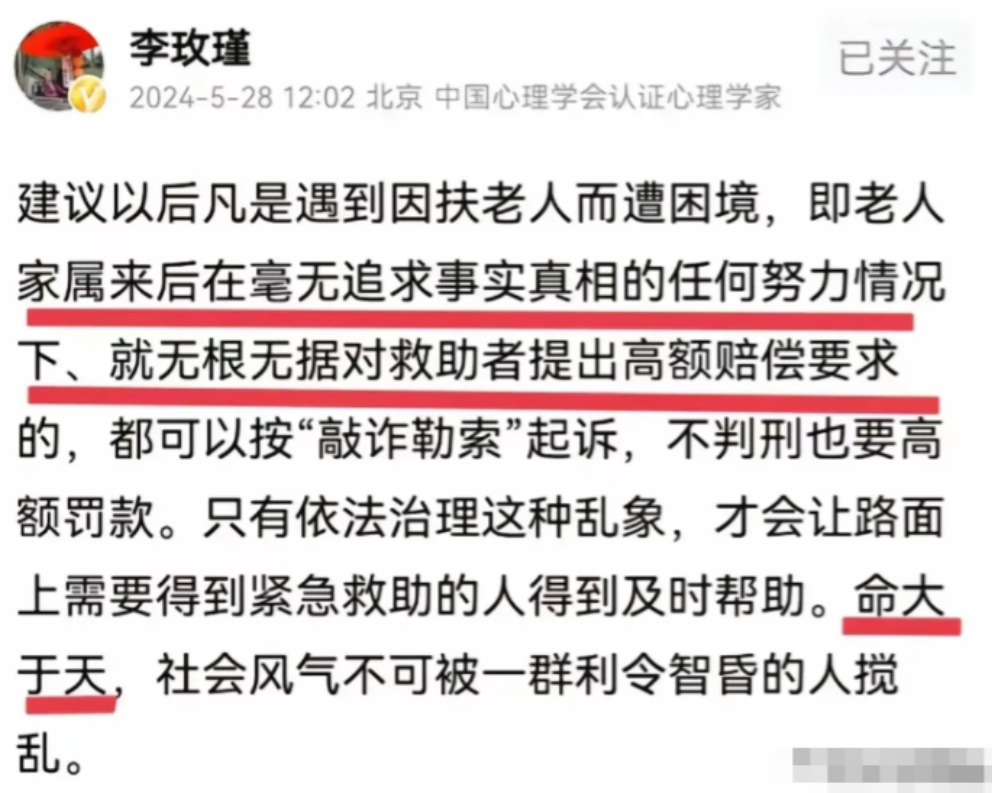 “终于有人站出来了!”2024年,中国人民公安大学李玫瑾建议:“凡是扶了老人被要