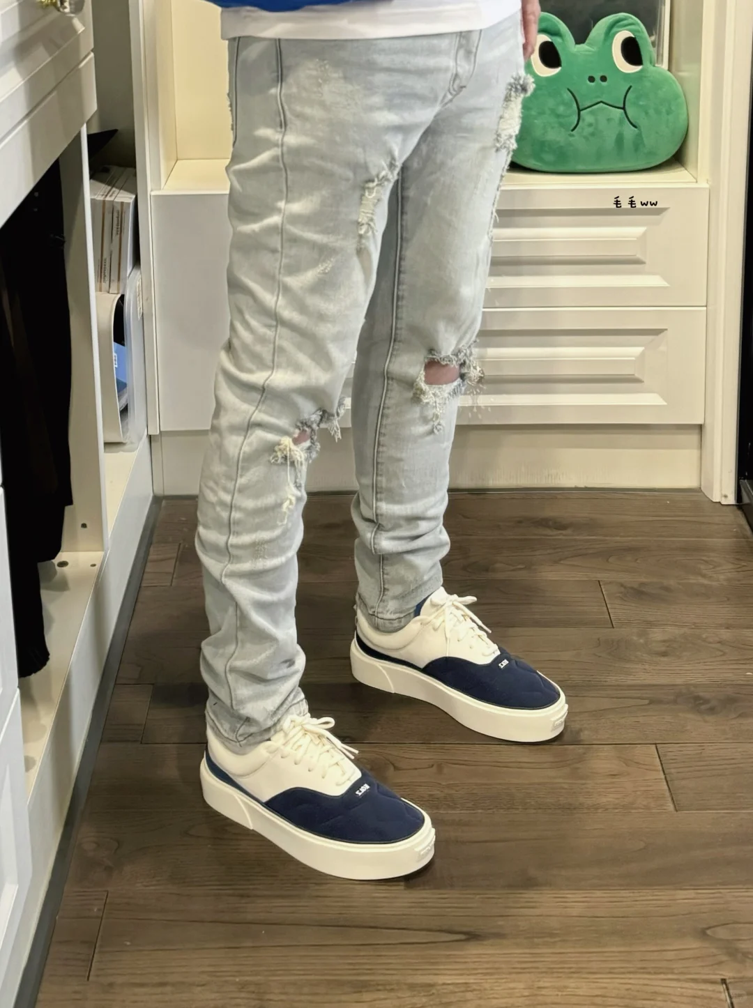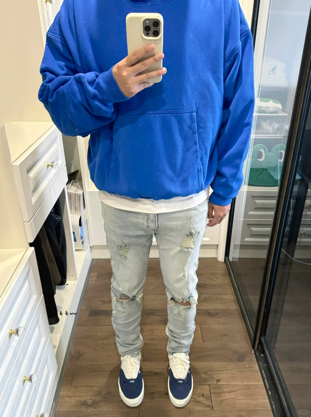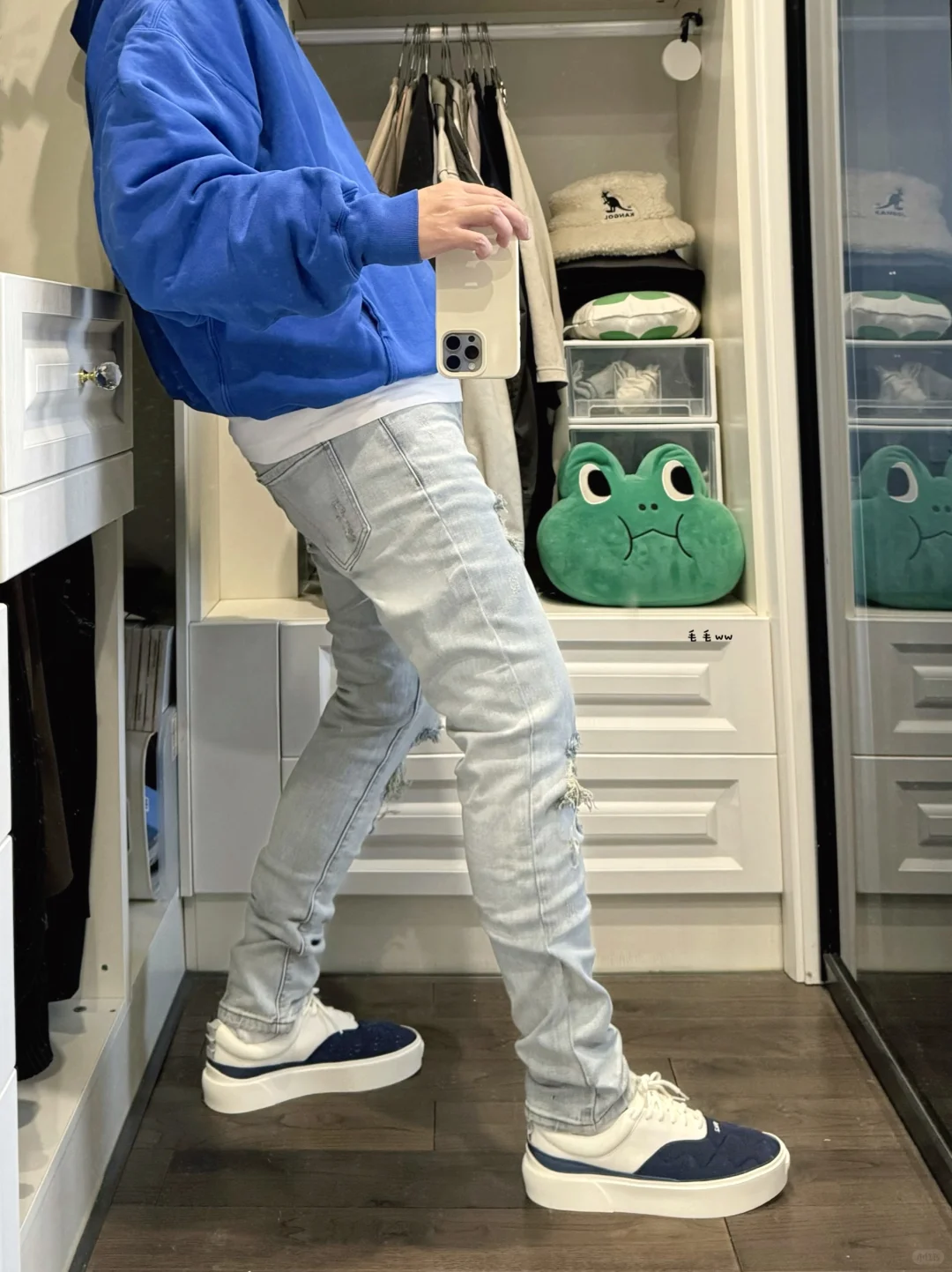-抓住破洞牛仔裤最后的机会,马上就要“漏风”了;读书的时候喜欢穿窄裤,显瘦效果很明显 . -克莱因蓝,侃爷的标志性配色,搭配白色或者浅蓝看起来很干净,高饱和度蓝色极具辨识度 . —————— . ✏️本人178cm75kg 球鞋尺码265mm(正常EU42) . 💭以上均为我个人观点,不喜勿喷,欢迎讨论。
