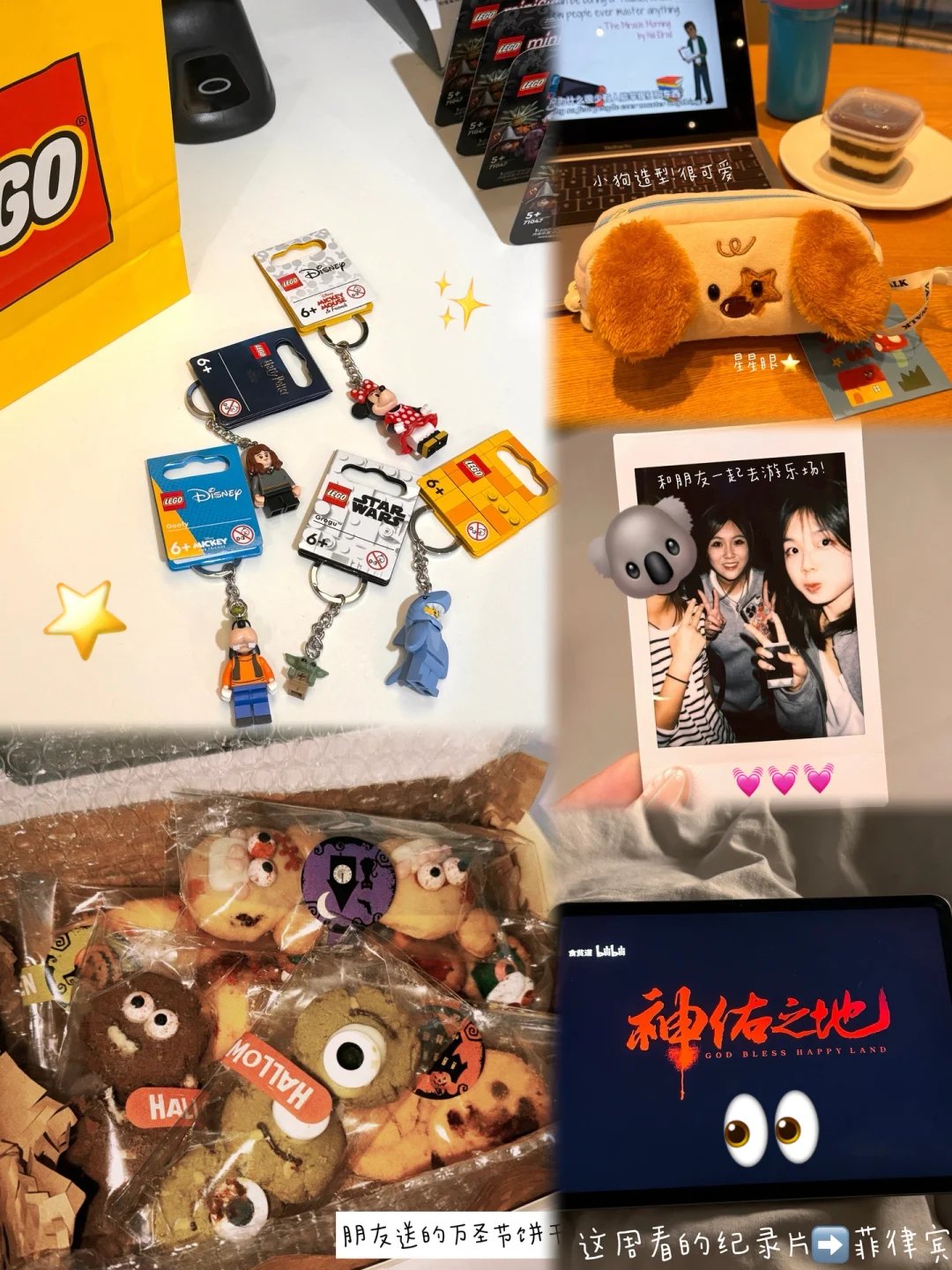 p1-2:特别喜欢LEGO挂件^ ^尤达宝宝好迷你好可爱 p3-5:万圣节 好朋友送的饼干!! 🎃👻好多眼睛喔👁️ 我们还一起去游乐场过万圣节!(其实主要是为了去看烟花🎆真的很漂亮!) 感觉这张拍立得很有氛围感^o^好喜欢我的牙牙🦷 p6-7:新买的笔袋✏️上大学后基本都不买文具了 但是这个笔袋实在是太可爱了🥹 p8-10:食贫道的纪录片《神佑之地》,看完对菲律宾有了一个很新的了解🤯两极分化非常严重,菲佣竟然是菲律宾的“现代民族英雄”,视频里有很多让我非常印象深刻的镜头🥹推荐大家去看