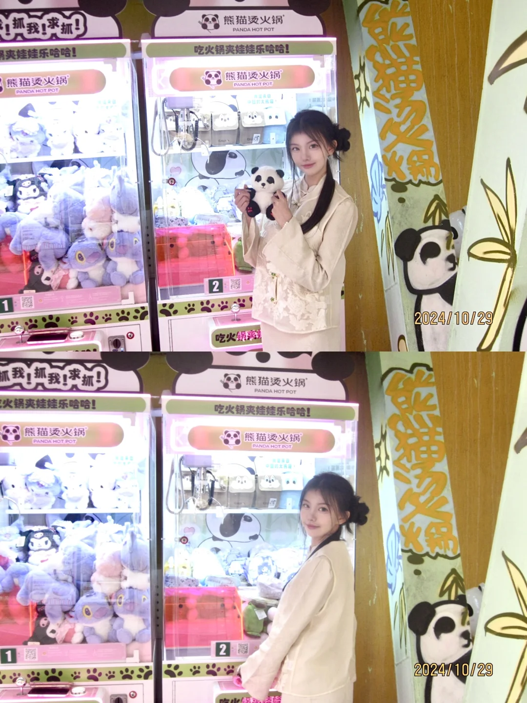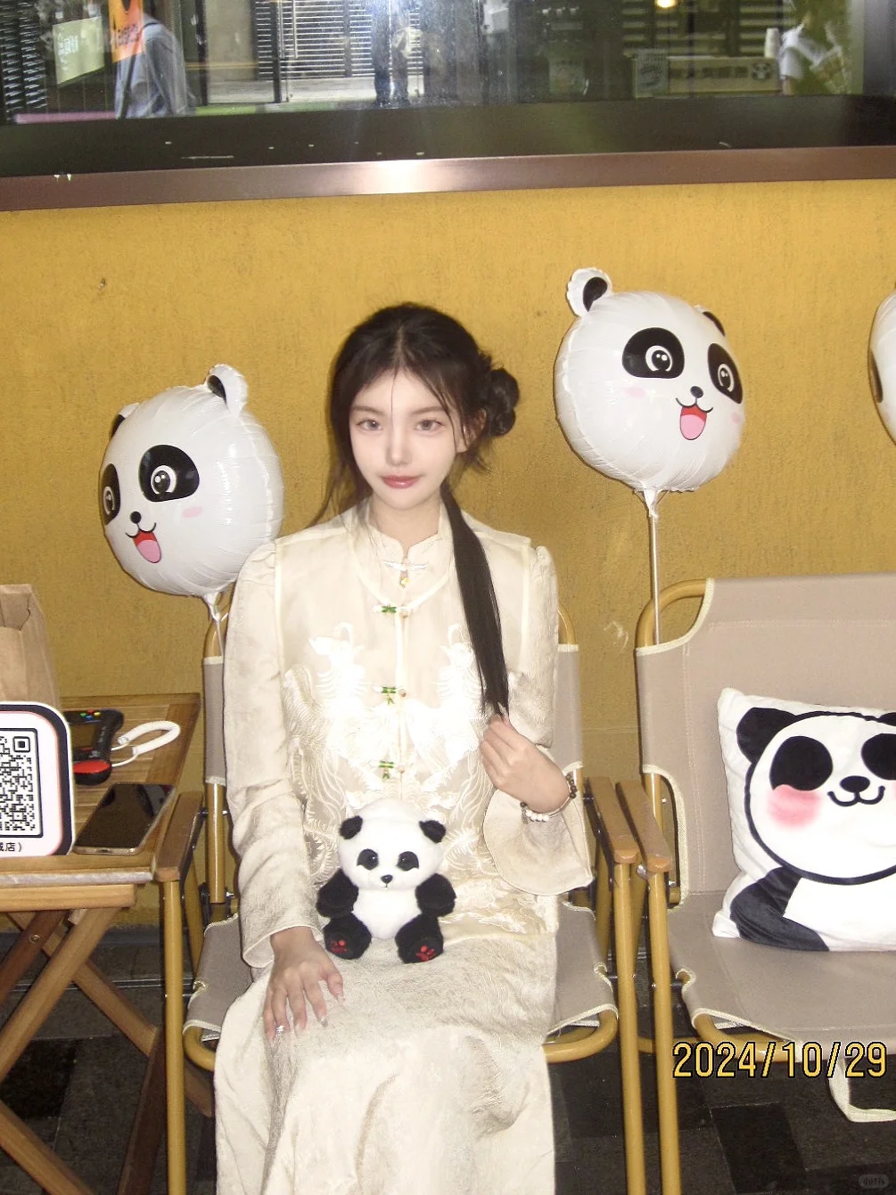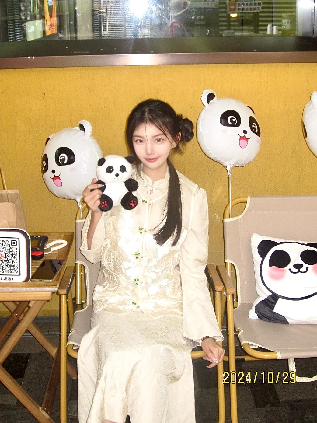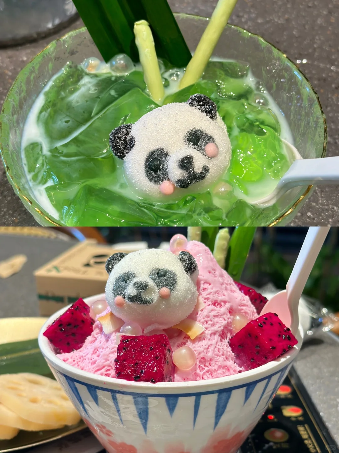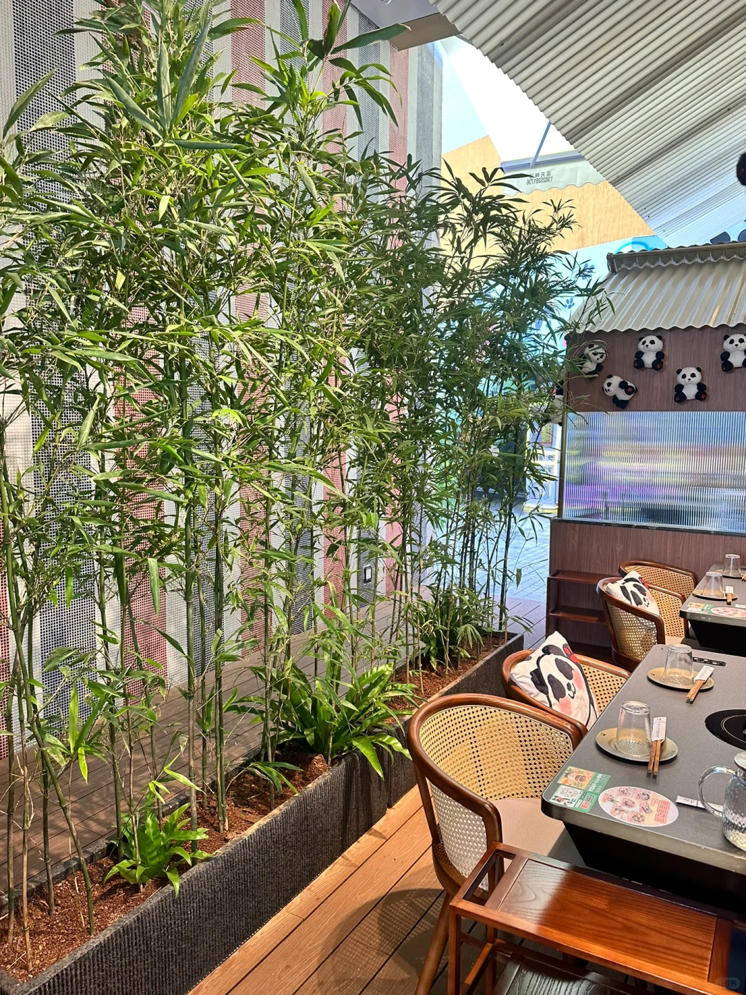餐厅内竹林环绕的就餐区域和可爱的熊猫公仔装饰仿佛瞬间穿越至熊猫的乐园~餐厅外是充满童趣的熊猫主题墙绘和气模,还有两台熊猫娃娃机供顾客体验,将美食与游乐融为一体,营造出一种独特的打卡氛围耶~🥰