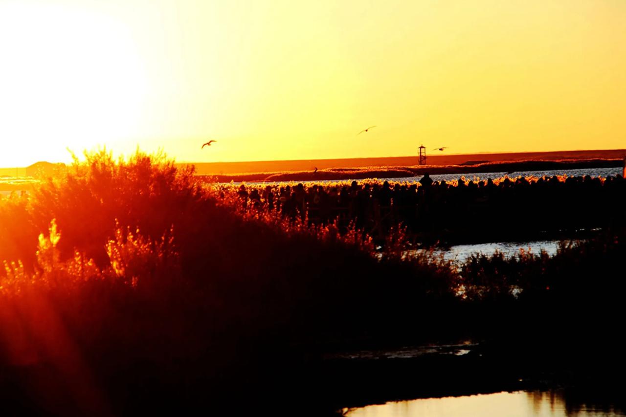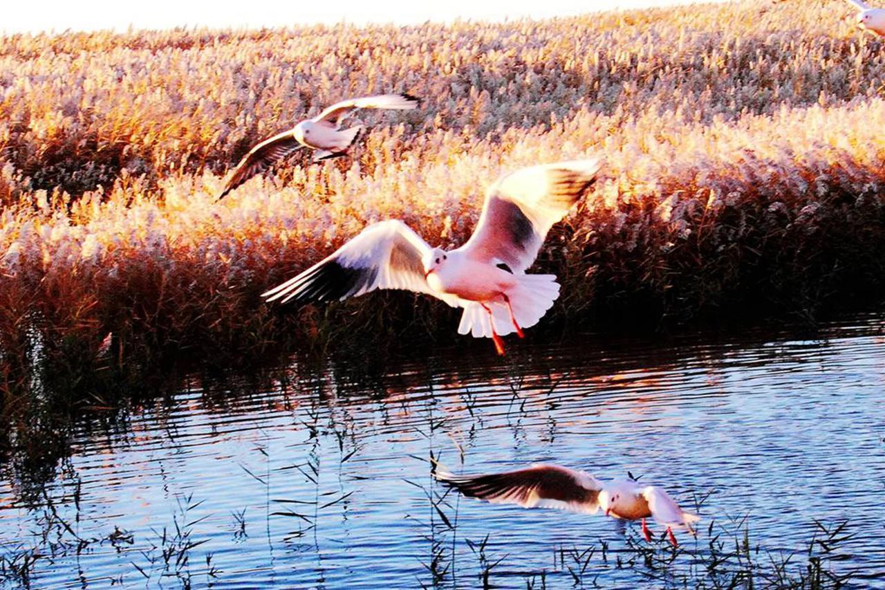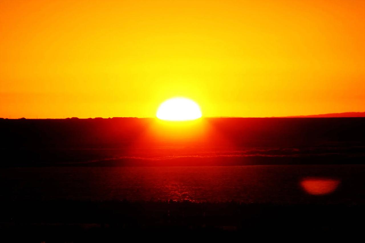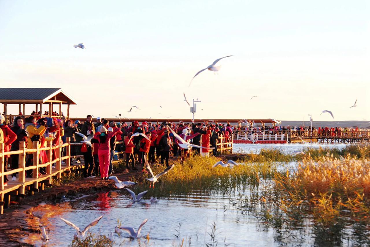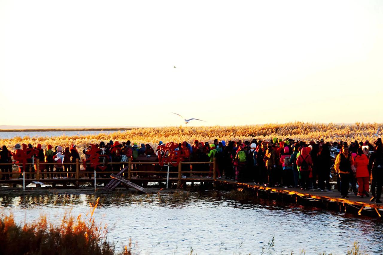 #秋日生活打卡季# #一张图片证明你来过内蒙# 【居延海看日出】20241110 参团到额济纳看胡杨,行程安排有到居延海看日出,然后去参观策克口岸,似乎很美好,其实是一个大坑。 2018年额济纳之行,10月11日,居延海拍日出。3:30就起床,5点出发,黑暗中赶到居延海,已经是人山人海。好不容易导游买到票。原本买了摆渡车票,奈何车少人多,只好跌跌撞撞摸黑往里赶,想要占个制高点拍日出。路远心慌,气喘腿软,个中滋味太舒爽。走到半路,赶紧爬上个沙堆,占个机位。只见前后左右的沙堆上,观赏台,沙坡上,海边栈桥上,都挤满了人。风大很冷,真有点受不了。冻了半个多小时,7:15,太阳出来了。天边无云,一个火球跃起空中,顿时光芒万丈,无遮无挡,白光刺眼。没有云彩,非常单调。也就几分钟时间,所谓日出美景,就完事大吉。好在还是拍了几张红彤彤的大火球,滥竽充数。还有霞光中人影和芦苇丛,光影之下,还算绚丽。 走下沙堆,赶往二号码头。风景不错,芦苇晶亮,海鸥飞翔,鸣叫抢食,沐浴在霞光中,非常漂亮。本可以在栈桥上拍点照片,奈何人太多,真怕会被挤到水里去。时间也不够,规定8:30集合。只能随随便便拍几张,急急忙忙出景区。又在车海中找车,太艰难了。等到人到齐了,已经是9点过了。到了策克口岸,居然又是长时间排队等候。也没啥可看的,就是拍个界碑。这安排实在欠妥。假如不忙着去策克口岸,看了日出之后,再用一小时在海边玩玩,拍拍海鸥,就要有意思得多。下午再去策克口岸,人都没有了,也不用排队,多好!当然,要是自驾去,那就更好了。只是千万要避开胡杨林这个时间段,游客太多了! #晒出你眼中最美的秋景#
