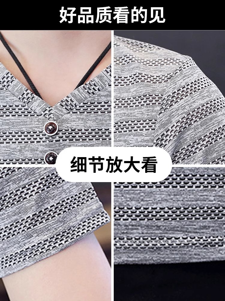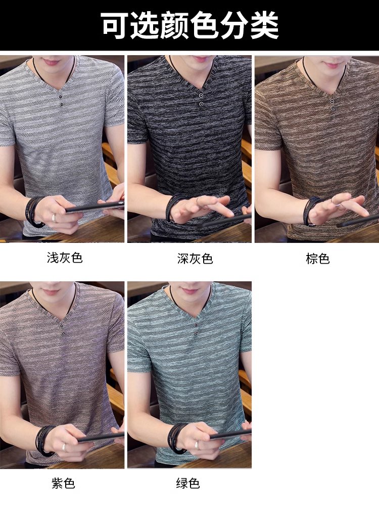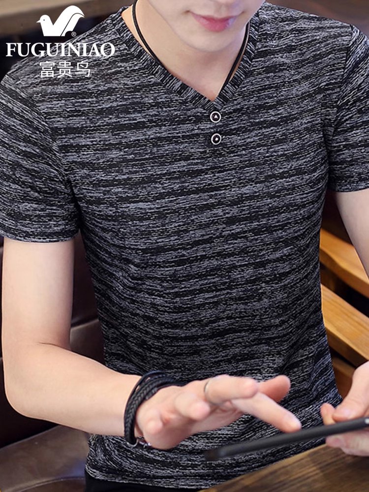 富贵鸟冰丝V领短袖T恤男士夏季薄款休闲上衣桃领半袖体恤衫男
