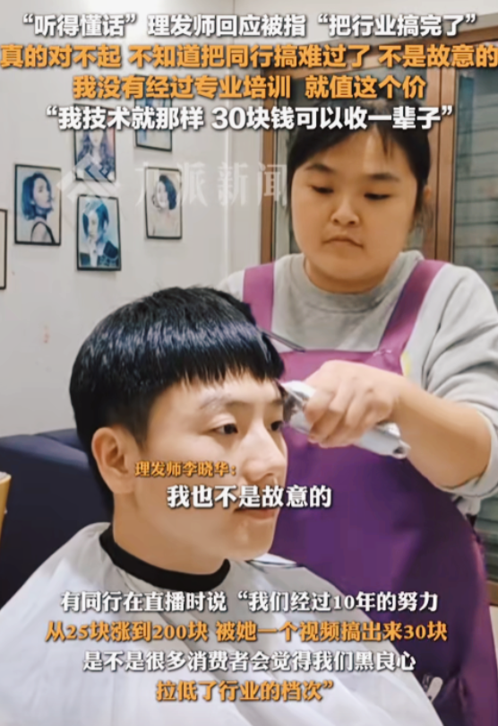 湖南怀化,理发师晓华回应同行的吐槽,她表达了自己深深的歉意,之前有同行表示,晓华把整个行业搞完了,她的出现让行业倒退十年,他们辛苦把理发的价格提到200元,结果她理发只需30元,这不是让消费者认为他们黑心吗?网友:们生气的并不是你30 而是因为他们又贵又菜! 11月10日,晓华对于同行的喊话,迅速做出回应,她也没有想到自己的爆火竟然会给同行带来那么大的伤害,可她的技术最多只能收费30元,200元的剪发费用实在是太高了。 晓华在社交媒体上走红后,引发了大家广泛关注和讨论,她的成功不仅仅是因为高超的技艺,更重要的是她对顾客需求的高度重视和合理的价格定位。 其实在理发行业中,不少理发师不重视顾客的要求,过分追求自我想法,导致顾客对最终呈现的发型很是不满意。 而晓华则恰恰相反,她始终以顾客的要求为导向,努力实现顾客心目中的理想发型,这种以客户为中心的服务理念,使得她迅速赢得了大量忠实顾客。 与此同时,晓华合理的价格定位也是她成功的关键因素之一,有些理发师将价格提的非常高,但谁的钱都不是大风刮来的,尤其是男生隔段时间就要修剪头发。 200元的价格,很多人都承受不起,对于有经济实力的人来说,他们愿意花这个价格打整头发,也是因为其他理发师修剪的头发实在是太不好了。 要是想要追求完美的发型,他们只能付出更多的钱,而晓华的出现,不仅让众人沸腾了,也招来了不少同行的质疑。 有些理发师已经开始学习晓华的技术以及她和顾客相处的舒适度,但总有人想要跳出来说上晓华几句,如果理发实力真的过硬,自然会有顾客买单,抨击同行没有任何用。 值得注意的是,晓华除了技术好以及合理的定价外,她还利用新媒体平台进行自我推广,通过直播等方式,晓华展示了自己的技艺,也与粉丝建立了良好的互动关系。 一些理发师技术水平不高,却要价不菲,这严重损害了消费者的利益,还有理发师过分追求高端定位,忽视了大众市场的需求,这无疑是一种市场机会的浪费。 其实大家越来越注重个人形象,发型作为重要的外在表现,自然受到高度重视,可高昂的理发费用往往让人望而却步。