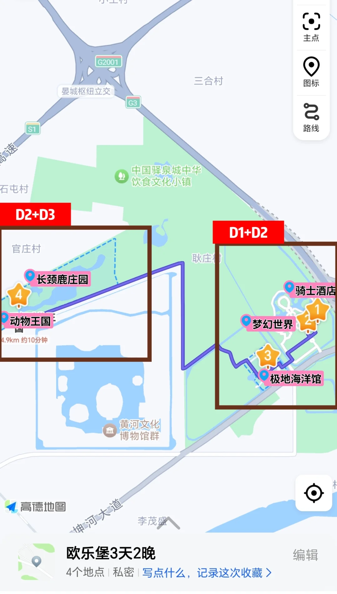 跟小伙伴们的踏秋之旅非常完美 泉城欧乐堡3天2晚 主要一个玩的明白且尽兴 好玩不累的轻奢之旅吧 干货攻略,体验感满满 . 🆒说在前面 ①提前下载三个地方的地图、时间表,存在手机; ②先去梦幻世界/海洋馆,再去动物王国,由俭入奢; ③万圣节特别活动很有趣,值得一去; . 🆕营业时间 梦幻世界10:00-17:30 海洋极地世界9:00–17:30 动物王国9:28–17:30 . ⏹游玩攻略 第1⃣天:梦幻世界,住骑士酒店 打车到骑士酒店,步行3min到梦幻世界,先刷项目再参加夜场活动。 🔷大人:尽情体验过山车(4种)、龙卷风、雷神摆锤、魔术风车等惊险刺激的游乐设施 🔷幼崽:100cm以上的可以玩丛林大冒险、鲁比汽车、小镇青蛙、跳转转杯、桑巴气球、魔力伞塔 🔷亲子:转马、4D儿童影院、儿童滑梯、童话转马、豪华转马、观光火车 🔷晚餐:景区晚餐,晚上花车巡展、无人机烟花秀、万圣节特别活动真的很棒 ①夜场开园互动15:00-15:20 检票口 ②马水马战表演场15:30-15:50,表演场 ③花车巡游:20:00-20:30 峡谷漂流-梦幻城堡西侧 ④电音派对:20:30-21:00 露营地 ⑤无人机烟花秀:21:20-21:30 喷泉广场 ⑥万圣节活动:黑死病全天开放,其他(有NPC)都是18:00开放 . 第2⃣天: 海洋极地世界&动物王国,住长颈鹿庄园 🔷上午:吃完早餐,可步行至海洋极地世界,位于梦幻世界旁边,步行10min左右,可以看到北极熊,大白鲸,企鹅,海豚等从赤道到南北两极的珍稀动物!各种海底演出,还可和海豚、海豹互动,表演时间贴在下面。 ①海洋倩影:10:00 星空餐厅 ②人鱼奇缘:10:30 鳐鱼、水中芭蕾,1F水下剧场 ③海洋剧场:11:30 海洋剧场,海狮海豚 ④人鲸奇缘:12:30 入口处白鲸互动 🔷下午:餐后去去动物王国&长颈鹿庄园酒店登记,寄存行李,领取专属代步车,开启奇妙的森林探秘之旅吧! . 第3⃣天:动物王国 全天:亲喂动物,缆车高空俯瞰五大洲的野生动物,好看的表演和免费儿童游乐设施,体验感满满!! 晚餐专属自助加烤鱼,闭园后很静谧,第二天早上在绿叶子餐厅享受与长颈鹿共进早餐,专属小车赶在4点半之前还车出园去20min去车站,8点之前基本可以到北京!继续搬砖! . ⬛️大交通 北京-济南西:打车大概二十几分钟到。 .