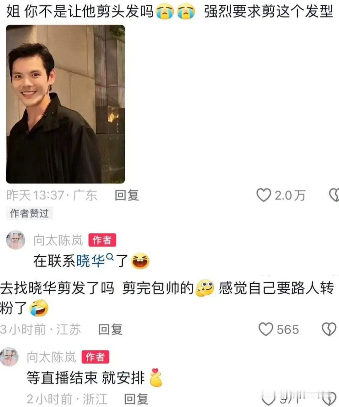#晓华回复向太#有意思的是,向佐本人正在湖南长沙参加活动,说不定真会去找晓华剪头发。这流量,他可不想错过。
