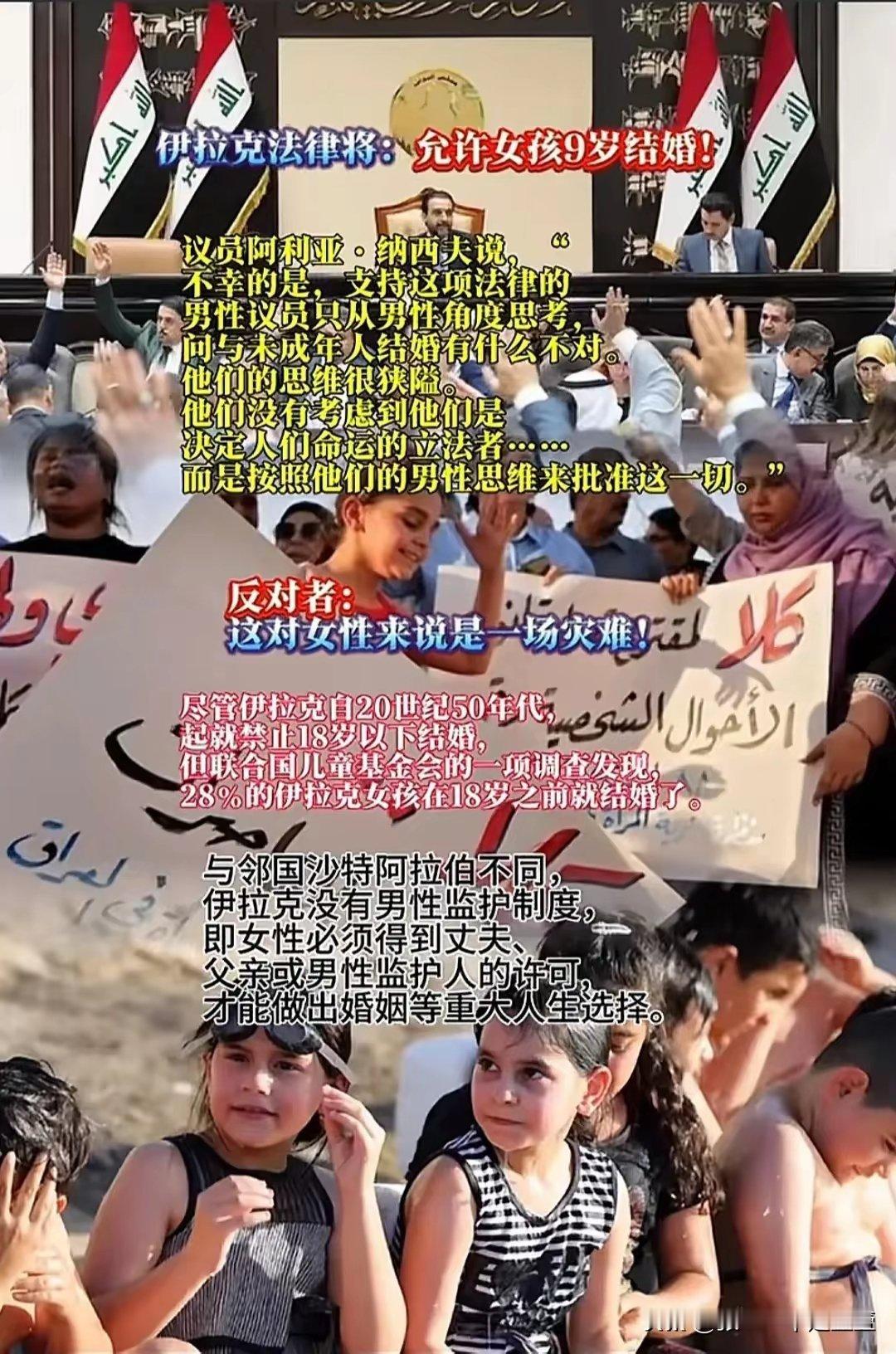 伊拉克女性法定结婚年龄或从18岁降至9岁!9岁是什么概念?身体还没有发育完全,小学还没读完!这很可能极大程度上打压伊拉克女性受教育的权利。