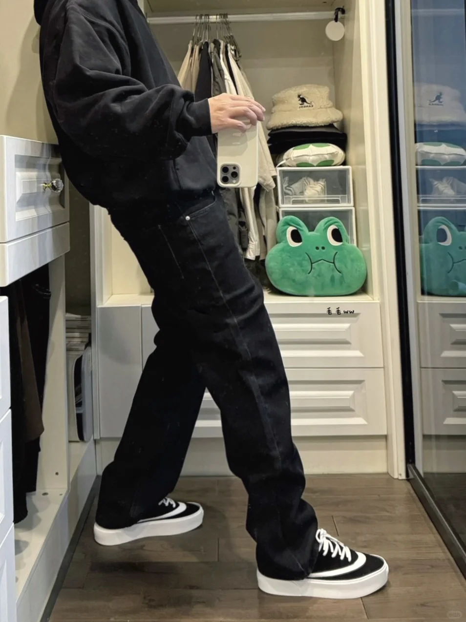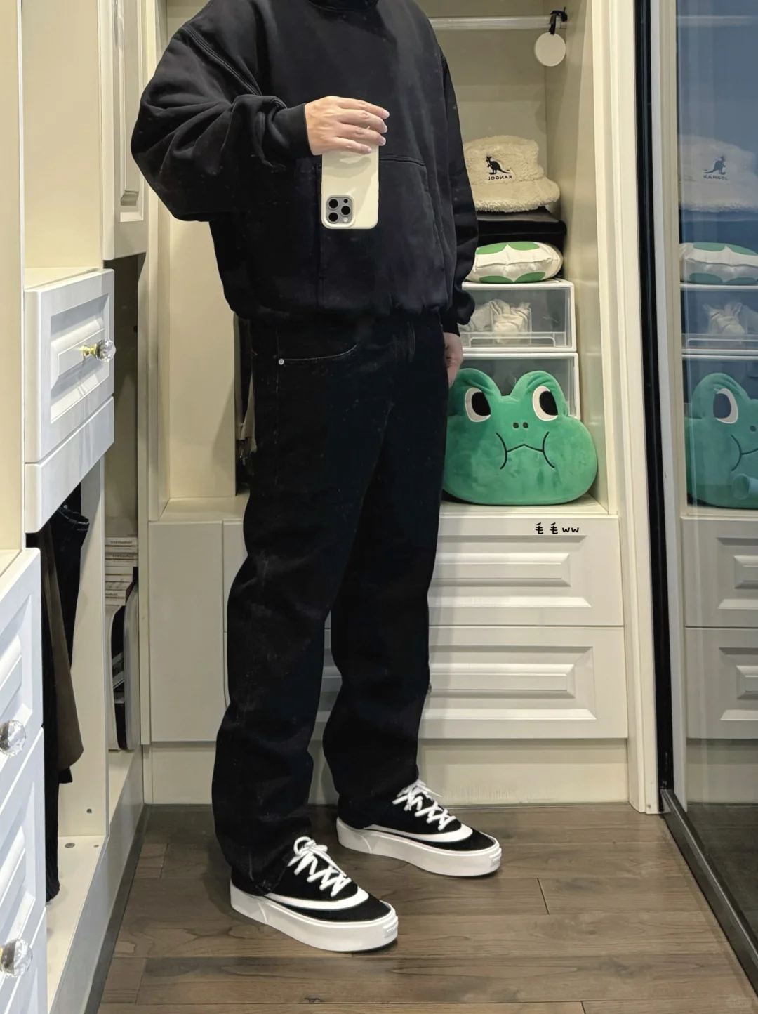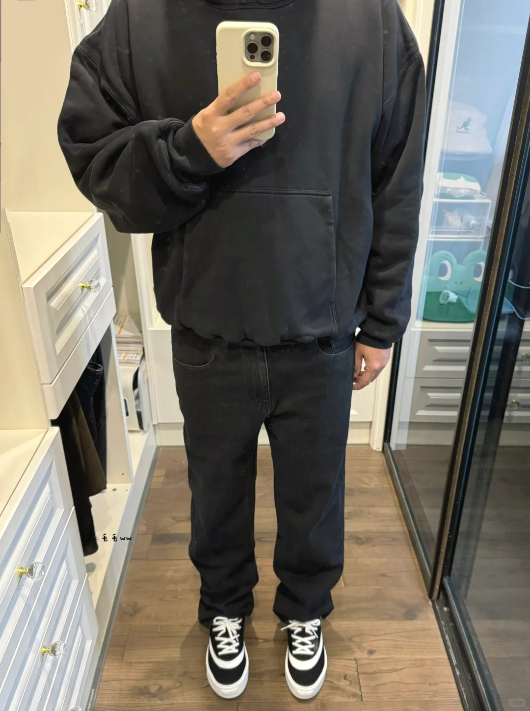-秋冬卫衣搭配牛仔,怎么简单就怎么来;配色选择了适合“懒人”穿搭的全黑look . -除了色系帮助显高显瘦,版型也很重要,直筒修饰腿型,再挑个厚度适中的面料四季穿着 . —————— . ✏️本人178cm75kg 球鞋尺码265mm(正常EU42) . 💭以上均为我个人观点,不喜勿喷,欢迎讨论。