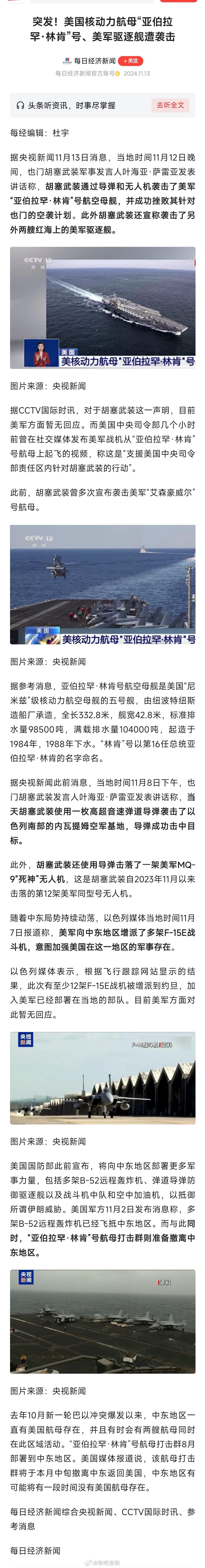 双十一刚过,天兵的航母就被胡塞打了——美国核动力航母“亚伯拉罕·林肯”号、美军驱逐舰遭袭击。